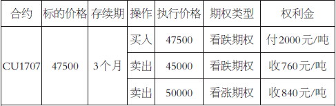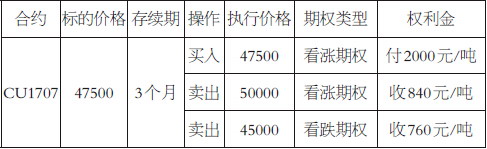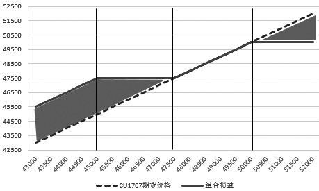 某铜冶炼企业A与下游B签订了一份远期合约,约定3个月后以当前CU1707合约47500元/吨(不考虑升贴水)的价格向对方交付1000吨铜。订单签订后,市场供需有所改善,A企业认为短期价格有上涨的风险,但上涨至50000元/吨之上的几率比较低,同时,A企业为现货空头,价格下跌有利,但下方45000元/吨又是一个比较强的支撑位,不容易跌破。出于以上考虑,A企业可以采用看涨三项式领口期权管理该风险。