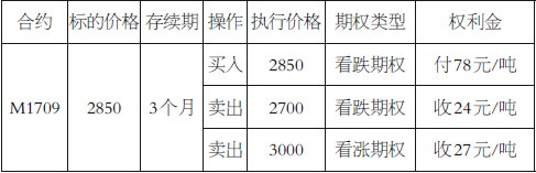 由于豆粕期货期权已于3月31日在大连商品期货交易所上市,所以其定价波动率不需要像场外一样考虑额外成本,此处买卖期权均使用14%的波动率,并假定期权到期仅剩3个月。该组合需要支付的净权利金=78-24-27=27元/吨,期权的最大行权收益=2850-2700=150元/吨,最大损失等于价格涨幅超过3000元/吨的部分。如果进一步将卖出看跌期权的行权价变更为2750元/吨,则可以收权利金37元/吨,将看涨期权的行权价变更为2950元/吨,则可以收权利金40元/吨,净权利金=78-37-40=1元/吨。可见对于波动率较小的品种,如果想大幅降低权利金,买卖期权的行权价设定不能虚值太多。虽然场内买卖期权的波动率点差非常小,但对于当前的市场来说还处于初级发展阶段,在构建该组合时必须要考虑流动性的问题,相应的保证金规则也不同于场外期权。