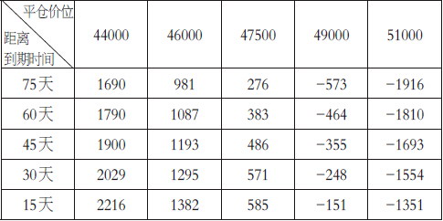 另外,可以看出,越接近到期时间,其收益会越接近最大收益。价格上涨时,其平仓价为负,该组合会发生亏损,但其亏损会小于价格的变动,同样,越接近到期日其亏损越接近价格超过卖出看涨期权的行权价50000元/吨之上的差额。但需要注意的是,在到期前,其最大浮亏是大于该差额的。例如:当距离到期日还有45天标的价格在51000元/吨时,其平仓价为-1693元/吨,再加上期初支付的400元/吨权利金,总亏损2093元/吨,价格相比于47500元/吨,上涨了3500元/吨,但相对于卖出看涨期权的行权价50000元/吨,却仅有1000元价差。