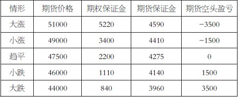头寸2:卖出行权价为50000元/吨的看涨期权,期限3个月,收取权利金840元/吨。该头寸与头寸1一起构成牛市价差组合,相当于放弃掉价格在50000元/吨以上的涨幅保护,对于现货头寸来说,价格的保护区间在47500—50000元/吨之间,价格大幅上涨的部分将得不到赔付。