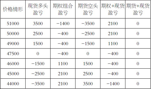 头寸2:卖出行权价为45000元/吨的看跌期权,期限3个月,收取权利金760元/吨。该头寸与头寸1一起构成熊市价差组合,相当于放弃掉价格在45000元/吨以下的跌幅保护。对于现货头寸来说,价格的保护区间在47500—45000元/吨之间,价格大幅下跌的部分将得不到赔付。