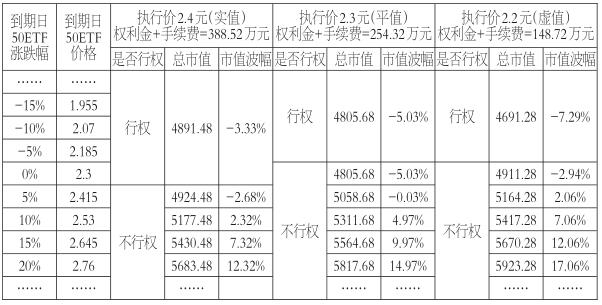 例如,吸取2016年9月的教训,刘先生在2016年10月31日以每份2.3元的价格买入2200万份50ETF,并通过赎回得到一篮子股票用于网下打新,底仓总市值5060万元。与此同时,买入2200张2017年6月到期执行价为2.3元的认沽期权合约,每张合约权利金1150元,权利金总成本253万元。手续费按每张6元计算,手续费总成本1.32万元。至期权合约到期时,刘先生将面临以下两种情况: