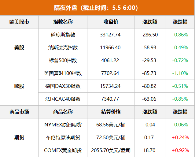 美股:道指收跌0.86%,报33127.74点;纳指收跌0.49%,报11966.40点;标普500指数收跌0.72%,报4061.22点。 欧股:德国DAX 30指数收跌0.51%,报15734.24点。法国CAC 40指数收跌0.85%,报7340.77点。英国富时100指数收跌1.10%,报7702.64点。 亚太股市:5月4日,香港恒生指数收涨1.27%,报19948.73点;恒生科技指数收涨0.55%,报3856.0点。韩国KOSPI指数收跌0.07%,报2499.69点。日本股市因假日休市一天。 人民币:在岸人民币兑美元北京时间03:00收报6.9128,较上一交易日夜盘收盘涨46点。 黄金:COMEX 6月黄金期货收涨0.92%,报2055.70美元/盎司。 原油:WTI 原油期货收跌0.06%,报68.56美元/桶;布伦特原油期货收涨0.24%,报72.50美元/桶。 财联社:据消息人士称,美国联邦和州官员正在评估银行股票可能存在的“市场操纵”问题;许多美国地区银行基本面良好,存款稳定,并保持有充足资本。 韩国关税厅:4日数据显示,韩国免税店今年第一季销售额同比减少26%,为3.1万亿韩元(约合人民币162亿元),仅为疫前2019年第一季的55%。 苹果公司CEO库克:需要围绕人工智能(AI)解决大量的问题;AI拥有无限的潜力,AI功能嵌入到各种苹果产品中;将继续有序地将AI融入设备中。 俄罗斯副总理诺瓦克:当地时间5月4日,俄罗斯将在联邦层面减少石油产量至2023年底,对欧盟的管道石油出口减少了超过三分之二,仅有少部分出口以海运进行了替代。此外俄罗斯石油减产将在独立机构的监督下进行。 财联社:美国财政部发行1个月期国库券的中标收益率创出该期限国库券的历史新高,凸显出财长耶伦宣布最早6月初就可能耗尽现金之后,债务上限形势已经迅速发生了转变。财政部周四以创纪录的5.84%中标收益率发行了500亿美元4周期国库券。 中国基金报:美国摩根士丹利银行计划在今年二季度裁员约3000人,这相当于除财富管理部门之外的全球员工总数的5%。如果得以实施,这将是摩根士丹利半年内第二轮裁员。去年12月,该行曾宣布决定裁员2%,即约1600名员工。 界面新闻:道明银行与FIRST HORIZON(第一地平线银行)双方同意终止合并协议,根据终止协议的条款,道明将向First Horizon支付2亿美元现金。