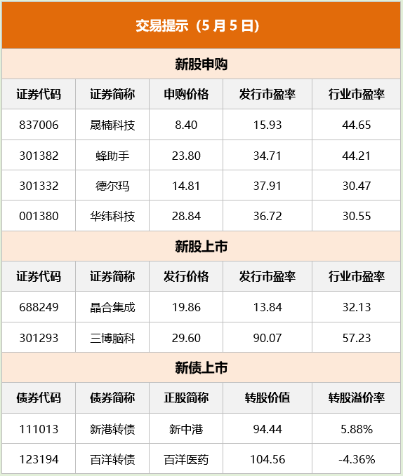 中国联通:日前,中国联通与腾讯进一步深化合作,共同出资设立的云宙时代科技有限公司正式在京成立。 拼多多:5月4日下午,对于外媒报道的“拼多多总部从中国迁至爱尔兰”的消息,拼多多方面回应称严重失实,纯属误读。拼多多相关负责人表示,拼多多出生在上海,成长在中国,拼多多总部始终在中国上海,不会改变。 京东:5月4日,“京东青年城”正式启动,该项目用地正是京东此前花30亿元买下的地块。该项目将建成近4000套自持员工租赁公寓,其中还为实习生准备了千余套公寓,并配备幼儿园、游泳馆、休闲健身等区域。这一项目的总投入预计将超过60亿元。 阿里巴巴:有媒体称,阿里巴巴的国际在线商务部门考虑在美国IPO。对此,阿里国际数字商业集团方面对记者表示,目前没有上市计划。 天邦食品:光大证券金阳光APP显示股票的停牌、可能被终止上市等事项均为不实信息。已于知晓上述不实信息的第一时间与光大证券有关负责人对接处理其APP界面显示错误信息事项,光大证券金阳光APP界面已删除上述不实信息。 唐德影视:公司不直接拥有相关AIGC技术。截至5月4日,相关技术尚未大规模应用于公司的剧集与电影制作等内容创作中,未对日常经营产生重大影响。没有承接相关业务订单,也未产生相关业务收入。近期经营情况及内外部经营环境未发生重大变化。 昆仑万维:为了更好地聚焦资源在AGI和AIGC业务板块,公司年初将StarX 和Ark Games 合并成StarArk,新主体将聚焦AIGC业务板块,以音乐AI和游戏AI为方向,并计划在 2023年年内陆续发布音乐AI和游戏AI产品;展望未来十年,昆仑万维将“ALL in”AGI和AIGC,从集团层面整合各板块资源,优化配置,推动业务发展落地。 璞泰来:通过全资子公司璞泰来(新加坡)有限责任公司在瑞典投资设立紫宸科技(瑞典)有限责任公司,并开展瑞典10万吨锂离子负极材料一体化生产研发基地的建设工作,项目投资金额不超过157亿瑞典克朗。 久立特材:公司控股股东久立集团于4月6日至4月28日期间通过二级市场合计增持公司股票630.425万股,占公司总股本的0.65%,交易总金额为9946.61万元。久立集团不排除进一步增持公司股票的可能。 南都电源:公司为中国移动2022年至2024年通信用磷酸铁锂电池产品集中采购项目的中标单位,中标金额(含税)约为2.34亿元。