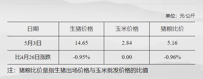 猪粮比价为5.16 较4月26日下跌0.96% 发改委网站 05月08日 据国家发改委数据,截至5月3日,全国生猪出场价格为14.65元/公斤,较4月26日下跌0.95%;主要批发市场玉米价格为2.84元/公斤,较4月26日持平;猪粮比价为5.16,较4月26日下跌0.96%。(文章来源:发改委网站) (责任编辑:admin)