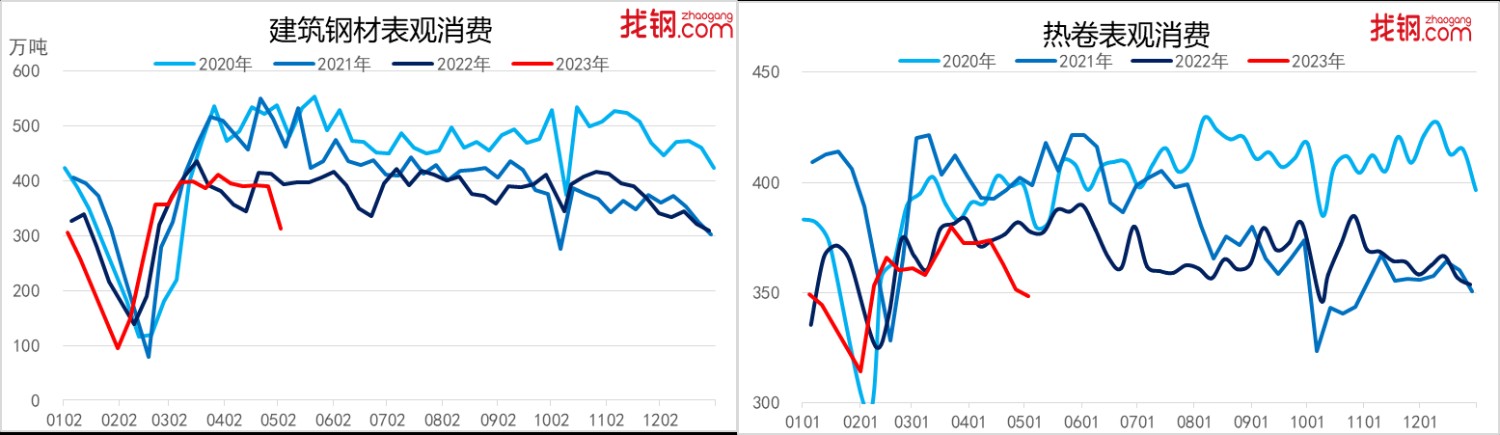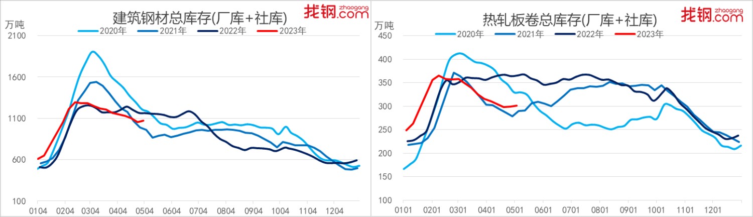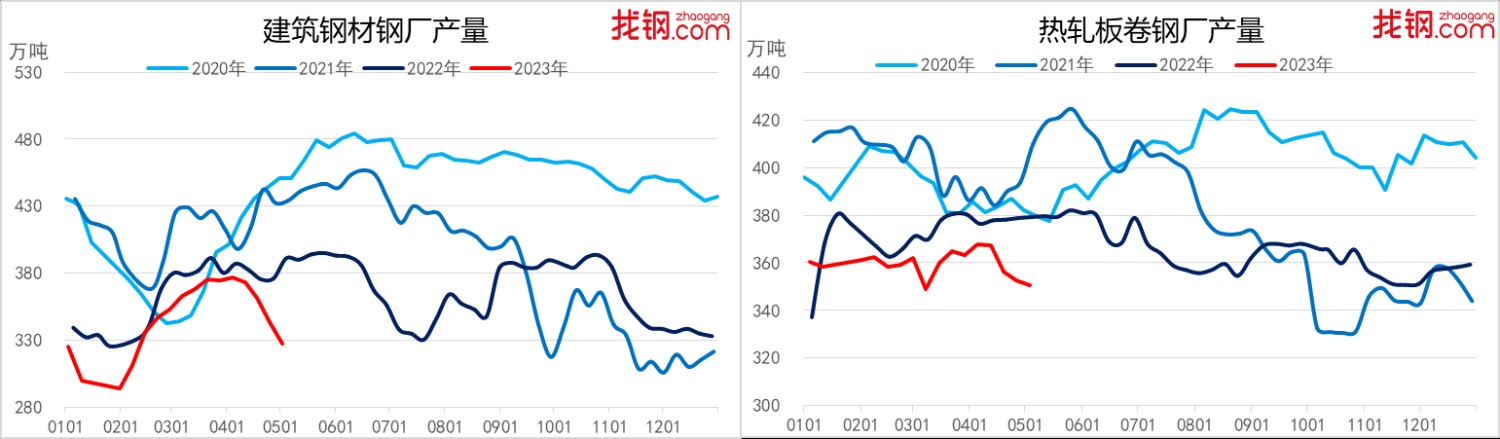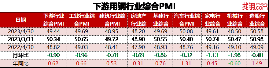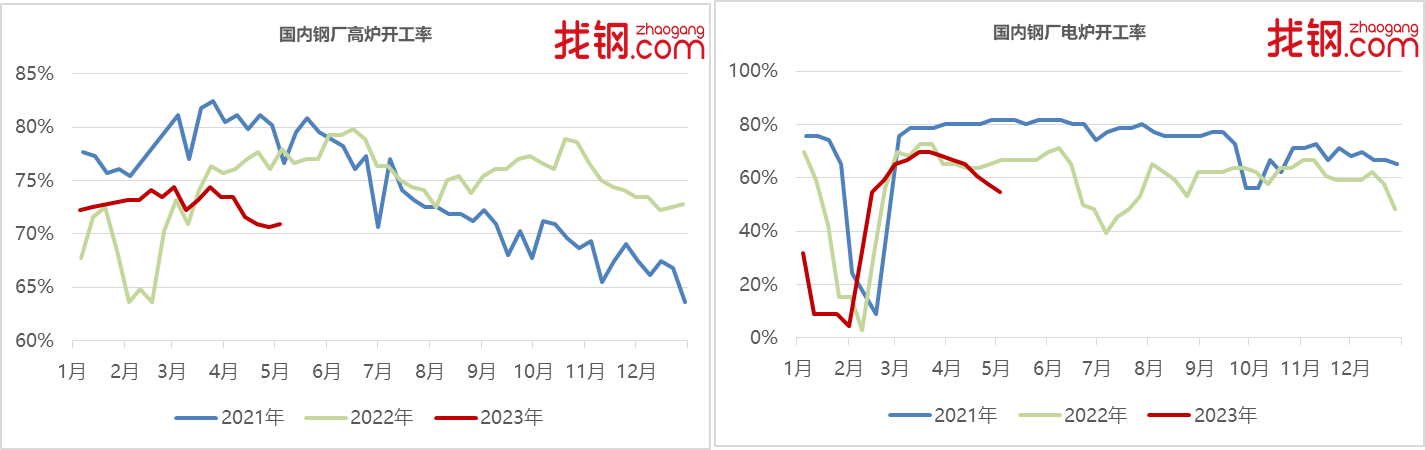4月钢材市场,由于钢材产量处于相对高位,同时需求有所走弱,钢材需求强度难以匹配供应增量,导致钢市供需矛盾有所累积,叠加原料成本有所下移,使得钢材价格整体明显回落。 展望5月份,钢材成本有望继续下移,同时钢厂检修减产增多的情况下高供应压力或有所缓解,整体供需格局有望改善,钢材价格或震荡筑底企稳运行。 钢厂检修减产增多钢材产量高位小幅回落 从钢厂生产情况来看,由于4月份以来钢材价格明显回落,钢厂生产盈利水平有所收窄,叠加钢材需求从旺季向淡季转换,国内高炉及电炉钢厂检修减产情况增多,高炉及电炉开工率高位回落,尤其电炉钢厂减产最为明显。截至5月3日,找钢网跟踪调研的国内独立电炉钢厂开工率为54.55%,周环比下降3.03个百分点,月环比下降6.39个百分点;高炉方面,找钢网跟踪的国内高炉钢厂开工率为70.93%,周环比上升0.32个百分点,月环比下降2.55个百分点。 ![]() 钢材生产方面,截至5月3日,找钢网跟踪调研的国内钢材周度总产量为790.03万吨,月环比下降67.16万吨,环比降幅7.8%。 ![]() 从不锈钢产量来看,4月份冷轧不锈钢产量112万吨,月环比增加0.9%,年同比降19%。目前来看,不锈钢产量同比仍处于相对低位,整体供应压力相对较小。 ![]() 4月份以来,随着钢价明显回落,钢厂生产利润再次被挤压,叠加需求有所下滑,钢厂减产检修情况有所增多。据找钢网不完全统计,4月国内有35家钢厂存在检修,其中检修影响铁水56.26万吨,螺纹42.91万吨,线材22.55万吨,热轧8.51万吨,冷轧13.29万吨,中厚板17.56万吨,其他19.31万吨。从具体数据来看,4月下旬以来国内钢厂减产检修情况明显增多,但同比来看目前钢厂减产力度依然偏小。 ![]() ![]() 需求季节性回落下游用钢行业PMI小幅下降 2023年4月份,找钢网调研的下游行业PMI综合指数49.44%,较上月环比降0.9个百分点,较去年同比升0.62个百分点。 4月份,市场受季末月初回款压力、需求季节性回落等因素影响,市场情绪转弱,建筑及工业行业PMI小幅下滑,整体景气指数有所下降。 ![]() 分行业来看,建筑行业方面,4月份,建筑用钢行业PMI小幅回落,叠加部分地区开工速度减慢,使得行业整体景气指数小幅下降;房地产行业,受保交楼政策因素影响,行业竣工良好,但新开工项目受限,使得行业整体景气指数有所回落。 工业行业方面,4月份工业行业景气指数环比下降,同比上升。5月份来看,随着国内专项债资金的陆续到位,基建等工程项目加快形成实物工作量,基建用钢有望继续释放增量,但房地产受新开工下滑的影响,对用钢需求或形成拖累。工业用钢方面,整体情况亦有所分化。一方面,受海外衰退预期因素影响,或使得出口增速减缓;另一方面,在国内刺激消费政策下,汽车及家电等内需仍有回升空间。 从钢材表观消费来看,截至5月3日,找钢网跟踪调研的钢材周均表观消费量为843.9万吨,月环比下降40.71万吨,环比降幅4.6%。目前来看,5月初钢材表观消费的下滑,主要还是由于五一假期的影响。随着假期的结束,预计5月份钢材消费仍有望修复性改善。 ![]() 淡旺季转换钢材库存去化有所放缓 从钢材库存来看,4月国内钢材库存继续去化,但由于需求整体季节性走弱,导致钢材库存去化速度有所放缓。截至5月3日,找钢网调研的建筑钢材库存总量(钢厂库存+社会库存)为1070.09万吨,月环比下降78.88万吨,环比降幅6.9%;热轧板卷库存总量(钢厂库存+社会库存)为301.19万吨,月环比下降9.3万吨,环比降幅3.0%。5月份来看,南方降雨天气增多,钢材需求旺季结束,钢材库存去化或进一步放缓。 ![]() 从不锈钢库存来看,截至4月28日,佛山、无锡两地不锈钢库存88.11万吨,环比上月降20.4%,同比去年增18.5%。由于下游情绪有所好转,补库意愿增强,不锈钢库存总量延续降势,但仍处于历史同期相对高位。 ![]() 钢价明显回落钢厂生产利润环比下滑 钢材成本方面,4月份以来由于煤焦、铁矿等原料价格高位回落,钢材成本明显下移,但同时钢材价格亦明显下跌,钢厂生产利润环比有所下滑。 具体来看,利润方面,截至5月4日,找钢网调研的高炉和电炉钢厂螺纹钢吨钢生产利润分别为32元/吨和-127元/吨,月环比分别下降15元/吨和117元/吨,年同比分别下降170元/吨和46元/吨。 ![]() ![]() 5月钢铁行业高供应压力或有所缓解整体供需格局有望改善 展望5月份钢材市场,从基本面来看,产量方面,由于钢厂检修减产情况增多,预计5月份钢材产量继续小幅回落,供应端压力有望阶段性缓解。从需求来看,一方面,房地产受新开工明显下滑影响,整体对用钢需求或形成拖累,另一方面,基建持续加码,基建用钢有望继续释放增量,5月终端用钢需求有待改善。成本方面,煤焦及铁矿石等原料供应转向宽松,短期原料价格或仍有一定下行空间。综合来看,5月份钢材成本有望继续下移,高供应有望下降,整体供需格局有望改善,钢材价格或震荡筑底企稳运行。