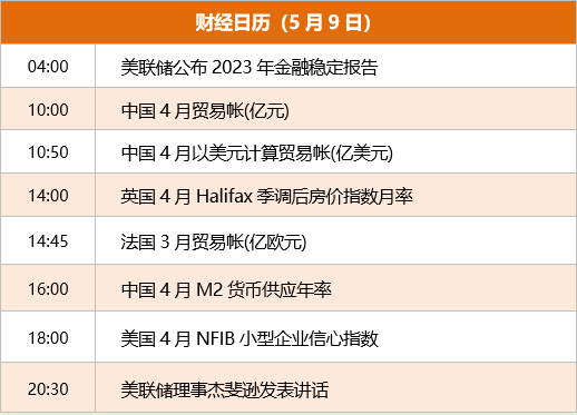 银保监会:印发《关于2023年加力提升小微企业金融服务质量的通知》,提出加强对小微企业信用信息的挖掘运用,增加信用贷款投放。《通知》聚焦重点领域小微企业需求,要求银行保险机构加强精准支持。 北京银保监局:印发专项文件,指导辖内银保机构提升乡村振兴质效。文件强调,辖内各银行保险机构要创新涉农金融产品和服务模式,针对涉农经营主体的融资需求特点,在贷款利率、担保条件、贷款期限等方面制定差异化政策,发展首贷、信用贷以及与生产经营周期相匹配的中长期信贷。 第一财经:近日,又有3家股份行相继下调了存款利率,这已是继2022年9月中旬6家国有大行率先下调各个期限人民币存款利率后的第四批“行动者”。至此,国有行、股份行均完成了对存款利率的下调。中小银行还在持续跟进中,下调以后,全国性商业银行的5年期定存整存整取利率都不超过3%,而中小银行不超过4%。 财联社:在消费反弹带动下,第一季度中国经济复苏强于预期,瑞银在财富管理报告中将中国全年GDP增长预测上调为5.7%。另外,美国和中国增长形势的此消彼长以及利率分歧,将成为美元兑人民币的主要驱动因素,当前美元兑人民币尚未完全反映这些因素,年底前美元兑人民币可能会跌至6.5及以下。 财联社:随着围绕美国债务上限问题的摊牌时刻临近,美国财政部长耶伦正加大警告力度,敦促国会尽快提高债务上限。耶伦还指出,美国已经在使用“非常措施”来避免违约,这不是财政部可以继续做的事情。目前,美国国会需要采取行动避免“经济灾难”。否则,“人们普遍认为,金融和经济混乱将随之而来。” 新华财经:日本央行布了最新的货币政策会议纪要。会议纪要显示,委员会成员表示,如有必要将毫不犹豫地采取宽松政策,为实现通胀目标继续实施宽松政策至关重要。 券商中国:近日,法国前总理弗朗索瓦·菲永日前在公开听证会上表示,在2007年至2012年任法国总理期间,“我和萨科齐总统被美国国家安全局监听了5年”。另外,菲永在听证会上还谴责美国滥用美元霸权,损害盟友国家经济利益。 日本总务省:2022年,在日本国内工作的65岁以上就业人口平均为912万人,比十年前增加了约5成。平均寿命与健康寿命的延长是这种现象产生的背景因素之一。但另一方面,也有因靠养老金生活拮据而不得不工作的老年人。 中疾控:随着我国对外交流的增加,我国新冠病毒主要流行株的构成受国际影响明显增大。4月下旬我国输入病例中,XBB系列变异株占比已达到97.5%,与全球XBB系列变异株占比基本一致。目前,我国新冠病毒主要流行株已变为XBB系列变异株。 山东省淄博市:一季度,实现生产总值1057.70亿元,同比增长4.7%。其中,限额以上批发、零售、住宿、餐饮业销售额(营业额)分别增长9.5%、15%、16%、25.2%,分别比1-2月提高4.7个、14.9个、7.2个、19.8个百分点。 Shibor:5月8日,隔夜shibor报1.4080%,上涨31.3个基点;7天shibor报1.7950%,上涨5.0个基点;3个月shibor报2.3860%,下跌0.7个基点。
