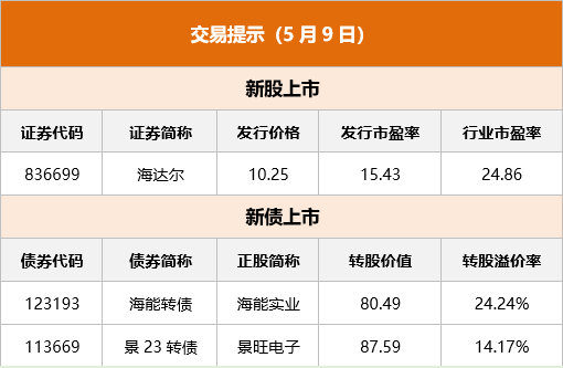 1、澎湃新闻:为进一步探索建立中国特色估值体系,引导央企投资价值发现,推动央企估值回归合理水平,上海证券交易所拟于5月11日举办“发现央企投资价值,促进央企估值回归”业务交流会暨国新央企股东回报ETF宣介会。上交所、中国国新相关领导将出席会议。 2、新华社:住房和城乡建设部、国家市场监督管理总局联合印发《关于规范房地产经纪服务的意见》。从十方面明确监管措施,加强房地产经纪行业管理,保护交易当事人合法权益。就二手房中介费过高、明码标价、操纵经纪服务收费等问题提出具体要求。 3、界面新闻:广东省印发《广东省全面推行清洁生产实施方案(2023-2025年)》。其中提出,大力推广节能及新能源汽车,推动城市公共服务及货运配送车辆电动化替代,提高城市公交、出租车、城市配送、邮政快递、机场转运、铁路货场等电动新能源运输工具的比例。 4、每日经济新闻:今年“五一”期间,山东电力现货市场有两天内共出现了连续22个小时的负电价,刷新了国内电力现货市场负电价持续时间纪录。业内人士认为,当前市场负电价的出现,叠加原材料价格下跌,发电侧盘活储能资产的意愿正在增强。 5、每日经济新闻:据报道,拜登计划在七国集团领导人广岛峰会前后签署一项行政令,严格限制美国企业对中国部分高科技产业投资;其中,人工智能、半导体和量子技术领域可能面临全面投资禁令。分析师表示,考虑到美资过去对中国AI、芯片和量子计算等领域的投资规模不大,即使措施落地,对我国相关产业实质影响不大。