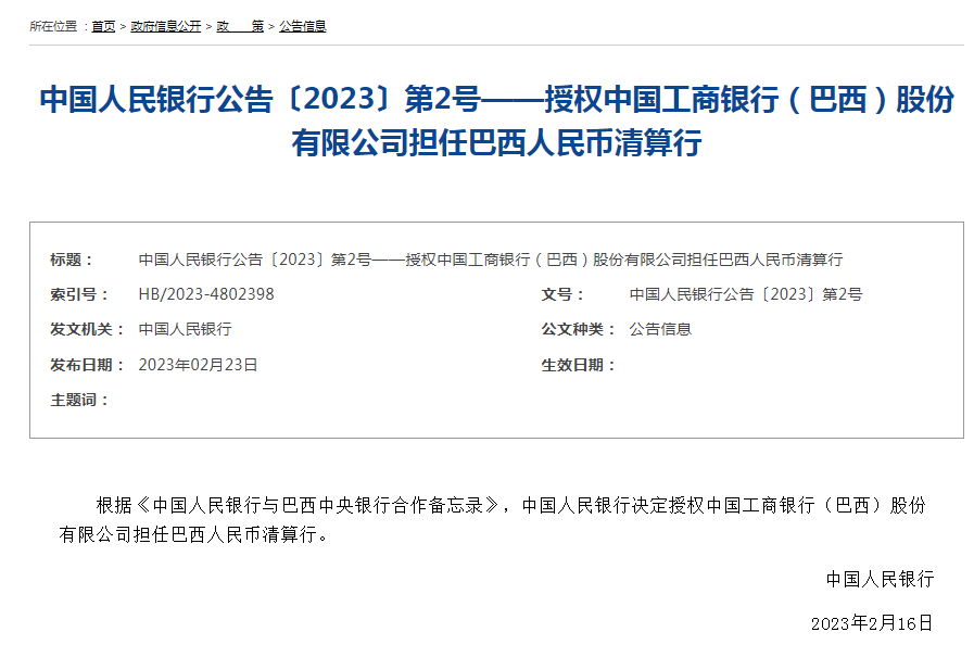 环球时报5月10日消息,据彭博社5月9日报道,全球最大的硬木纸浆生产商苏萨诺(Suzano)公司正考虑向中国出售以人民币计价的产品。这家巴西企业的首席执行官沃尔特·沙尔卡(Walter Schalka)表示,人民币的重要性正在上升。 报道称,中国是最大的大宗商品买家,占到苏萨诺所售纸浆的43%。沙尔卡告诉彭博社,全球的纸巾业务非常稳定,“在印刷和书写纸方面,美国业务有点变弱的信号。中国市场表现良好,而欧洲的情况变糟,市场份额正在下跌。”他强调,我毫不怀疑,中国将在全球市场上变得更加重要。 中国和巴西今年初签署了在巴西建立人民币清算安排的合作备忘录。有分析认为,如果苏萨诺最终作出以人民币与中方进行交易的决定,将成为巴西企业拥抱人民币的最新案例。 工银巴西办理首笔跨境人民币结算业务 据新华社4月12日消息,记者11日从中国工商银行(巴西)有限公司(下称“工银巴西”)获悉,工银巴西已成功办理首笔跨境人民币结算业务,标志着该行在巴西市场的跨境人民币业务取得实质性进展。 工银巴西负责人表示,该行未来将继续积极发挥巴西人民币清算行优势,努力为两国企业提供便利、高效、安全的跨境人民币结算服务,推动中巴经贸合作不断迈上新台阶。 中国和巴西今年年初签署了在巴西建立人民币清算安排的合作备忘录。2月23日,中国人民银行发布公告,授权工银巴西担任巴西人民币清算行。 ![]() 图片来源:央行网站 工银巴西是中国工商银行全资子公司,成立于2013年1月,总部位于巴西圣保罗,持有全功能商业银行牌照,可提供存贷款、结算汇款、外汇买卖、资金清算、电子银行和投融资信息咨询顾问等全品类金融服务。 2022年中巴双边贸易额扩大至1714.9亿美元 据中国商务部的数据显示,巴西2021年巴西总人口为2.13亿人,是世界第五人口大国。据央视新闻3月29日报道,由中国国际投资促进会、巴西出口投资促进局、中国巴西企业家委员会、巴西全国工业联合会联合主办的“中国-巴西商业研讨会”29日在北京举行。 中国与巴西同为发展中大国、重要新兴市场国家和金砖国家合作机制成员,自中巴全面战略伙伴关系达成以来,两国互惠互利,携手并进,在经贸投资合作领域取得了丰硕务实的成果。 在投资方面,中国是巴西重要的直接投资来源国;在贸易方面,中国已连续14年成为巴西第一大贸易伙伴;在承包工程方面,巴西是中国在拉美的第一大工程承包市场。 ![]() 数据显示,2022年,中国企业对巴西投资快速增长,投资金额同比增幅高达53.1%,中巴双边贸易额扩大至1714.9亿美元,同比增长近5%,中国企业在巴西承包工程新签合同额达18亿美元,完成营业额16.6亿美元。此外,Wind数据显示,今年2月份,中国对巴西出口金额为32.98亿美元,进口金额为71.47亿美元。 每日经济新闻综合新华社、央行网站、环球时报、每经网 (文章来源:每日经济新闻) (责任编辑:admin) |