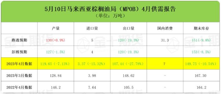 MPOB数据公布 | 棕榈油产量环比减少7.13% 金十数据 05月10日 马来西亚棕榈油局MPOB: 马来西亚4月棕榈油产量为1196450吨,环比减少7.13%。大幅低于预期。 马来西亚4月棕榈油出口为1074447吨,环比减少27.78%。大幅低于预期。 马来西亚4月棕榈油库存量为1497535吨,环比减少10.54%。低于预期。 马来西亚4月棕榈油进口为33678吨,环比减少15.32%。低于预期。 (文章来源:金十数据) (责任编辑:admin)