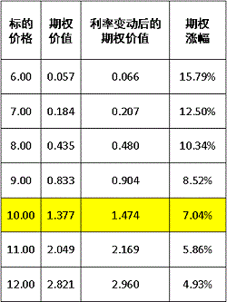 利率的变动对于不同期权的影响程度也有所不同,仍然以之前的例子,假设在其他条件未发发生变化的情况下,市场无风险利率从4%上升到了6%,则期权价值的变化如下表:
