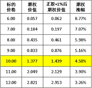 假设一个行权价为10元,标的隐含波动率为30%,剩余期权为1年,当期利率为年化4%的欧式看涨期权,在不同价格下,其股价上涨1%所对应的期权价值的变动幅度如下表: