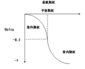 假设期权标的价格上涨1元,期权的理论价值上涨0.5元,则我们认为该期权的Delta=0.5.一般而言,看涨期权的delta值在0-1之间,通常平价期权的delta值在0.5附近,期权的价内程度越高,则delta值约接近于1,价外程度越高,则delta值越接近于0.从通俗的角度理解,一个行权价为0的期权,基本上可以认为它的波动与股价波动完全相同,而一个行权价极度高于股票现价,不可能在期权期限内到达行权价之上的期权则可以认为是一张废纸,价值为0不会随着股价波动而变化。看空期权的Delta值也存在类似规律。如下图所示: