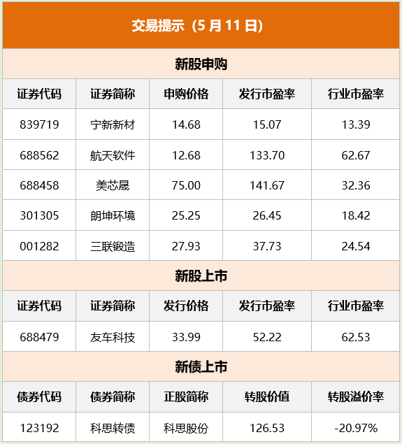 沪深股市:5月10日,沪指跌1.15%,报3319.15点,深成指涨0.14%,报11140.19点,创业板指涨0.73%,报2262.22点。汽车整车板块大涨,银行、证券、保险板块跌幅居前。 沪深港通:5月10日,北向资金全天实际净买入55.71亿元,创近一个月来最大净买入额。其中,沪股通净流入48.06亿元,深股通净流入7.65亿元。 龙虎榜: 5月10日,日内上榜龙虎榜个股中,资金净流入最多的是国光电器,三日净买入3.1亿元。机构参与龙虎榜中个股共涉及37股,其中16股被机构净买入,鸿博股份被买入最多,为1.35亿元。另外21股被机构净卖出,焦点科技被卖出最多,为1.89亿元。 融资融券:截至5月9日,上交所融资余额报8001.7亿元,较前一交易日增加17.97亿元;深交所融资余额报7274.97亿元,较前一交易日减少3.5亿元;两市合计15276.67亿元,较前一交易日增加14.47亿元。 证券时报:5月,包括券商、基金、险资等在内的众多机构仍忙于奔波于上市公司调研。截至5月9日,已有396家上市公司受到机构共计432次调研,该数据已大幅超过上月同期,从具体行业来看,机械设备、电子和医药生物最受机构关注。AI概念相关公司仍是机构关注的焦点。 经济参考报:随着非上市保险公司的年报陆续披露,“银行系”寿险公司业绩成色已现。10家“银行系”寿险公司2022年共实现保险业务收入3436.61亿元,净利润合计亏损19.36亿元。整体来看,“银行系”寿险公司保险业务收入稳步增长,但净利润承压,主要经营指标分化明显。 上证报:杉杉股份2022年年度股东大会在宁波召开,表决选举公司第十一届董事会非独立董事议案。此前卷入公司实控人之争的杉杉股份现任董事长郑驹,以及杉杉股份创始人兼前任董事长郑永刚遗孀周婷当选新一届董事会非独立董事。 中国证券报:港交所未来科技峰会在深圳举行。会上,港交所行政总裁欧冠升表示,在2018年港交所进行上市制度改革后,香港市场已经成为了全球领先的新经济和生物科技融资中心。自上市制度改革以来,香港新股市场65%的融资额来自新经济行业。 证券时报:A股对前期高点的突破暂未成功,预计分歧仍待消化,短线以盘整走势为主;“中特估”中长线看好,将对指数产生支撑,题材方面切换仍在持续,高位的前期热门科技股资金流出,低位高景气的“风光储”性价比优良,有望承接资金。 财联社:瑞银表示,截至3月底,国际机构投资者对中国股票持仓相对基准降低0.6个百分点,料国际投资者低配水平接近去年10月低点。瑞银表示仍看好中国股票市场,同时MSCI中国指数低于历史平均水平标准差,中国股市的风险回报具吸引力。