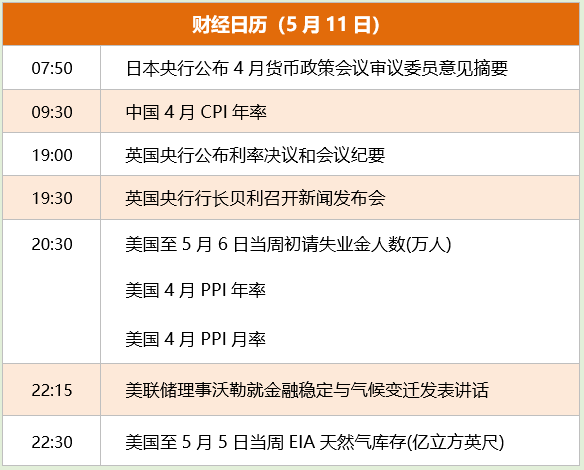 1、央视新闻:习近平在河北雄安新区考察并主持召开高标准高质量推进雄安新区建设座谈会时强调,坚定信心保持定力,稳扎稳打善作善成,推动雄安新区建设不断取得新进展。 2、银保监会:2023年5月10日下午,国家金融监督管理总局召开领导干部会议。中央组织部有关负责同志宣布了中央决定,李云泽同志任国家金融监督管理总局党委书记。 3、科技部:日前,科技部与国资委召开工作会商会议。科技部党组书记、部长王志刚强调,要支持中央企业面向国家重大需求,聚焦“卡脖子”领域,坚决打赢关键核心技术攻坚战,有效维护国家产业安全。 4、21世纪经济报道:相关部门下发通知,要求各银行控制通知存款、协定存款利率加点上限。对于通知存款利率,国有大行不能超过基准利率0.1个百分点,其他银行不能超过基准利率0.2个百分点。这是自2022年9月,银行业对主要期限存款挂牌利率一轮调整以来的又一次调整,不过市场对此有所预期。 5、界面新闻:美国4月CPI同比上升4.9%,连续第10次下降,为2021年4月以来新低,预估为5.0%,前值为5.0%。美国4月CPI环比上升0.4%,预估为0.4%,前值为0.1%。