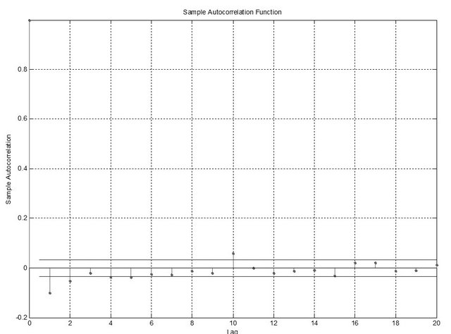 对VIX指数收益率进行自相关检验结果如图2,图中横轴表示滞后阶数,纵轴是自相关系数,当图中的箭头线在横线区间之内,说明对应阶数的自相关性不显著,反之,说明对应阶数的自相关性显著。