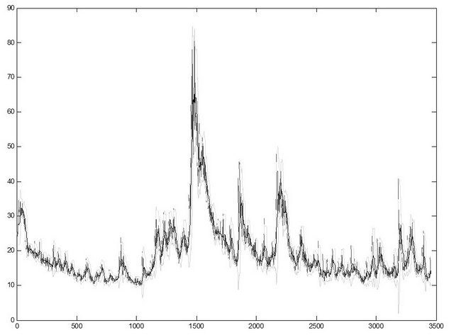 如果选择VIX指数90%的概率落在回归区间,结合上述结果,取rariodown=-1.8,rarioup=2.1,较为合适。对于rariodown=-1.8,rarioup=2.1时,VIX指数走势和其上下界的走势,如图6所示。