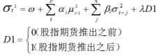 上式中,D1系数λ的含义是波动性的代理参数。要证明上证50ETF期权对上证50ETF的波动性产生影响的一个重要前提条件是λ通过了显著性检验,反之则说明这种影响不存在。若λ>0,就可以证明上证50ETF期权产生的主要影响是使上证50ETF的波动性加大;若λ<0,则说明上证50ETF期权产生的主要影响是使上证50ETF的波动性减小;若λ=0,就表明上证50ETF的波动性没有发生改变。