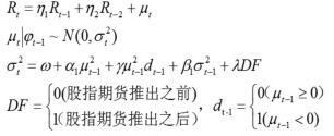 由于新型金融产品的出现对现货市场的冲击可能具有非对称性特征,所以我们采用带虚拟变量的TARCH模型来验证,具体形式如下: