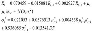 为了进一步分析其中波动性的影响,构建GARCH模型是在整个样本区间内(2013年1月4日至2016年12月2日)进行的,同时引入一个虚拟变量D1来对GARCH模型进行修正。此时,模型形式如下: