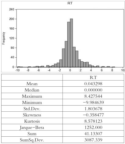 接着,使用Eviews7.2软件得出整个样本期间,上证50ETF日收益率数据的统计特征,如下图所示: