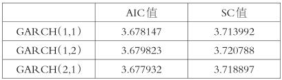 根据AIC准则和Schwarz准则,分别对GARCH(1,1)、GARCH(1,2)、GARCH(2,1)模型中条件方差的拟合效果进行统计,结果如下: