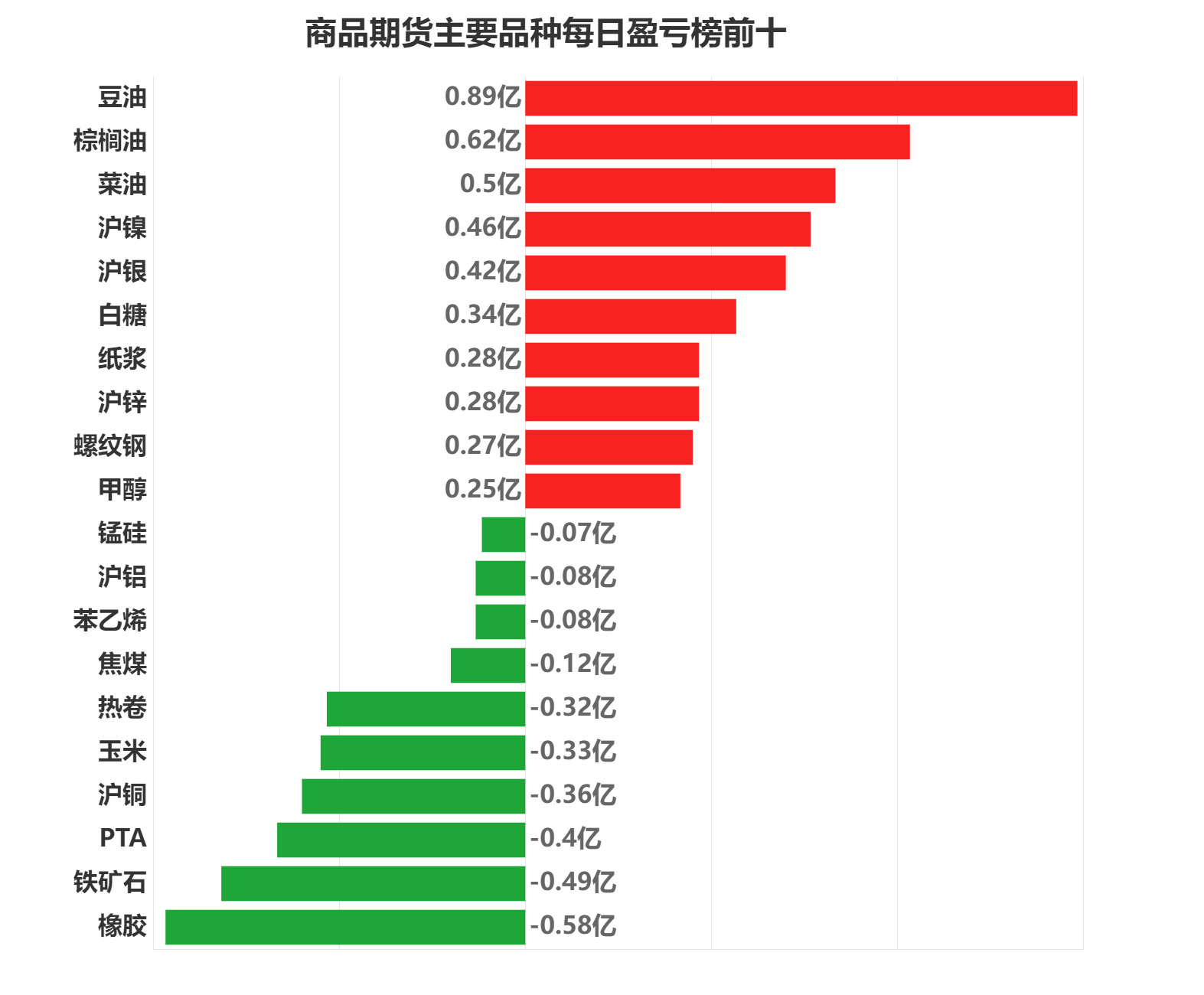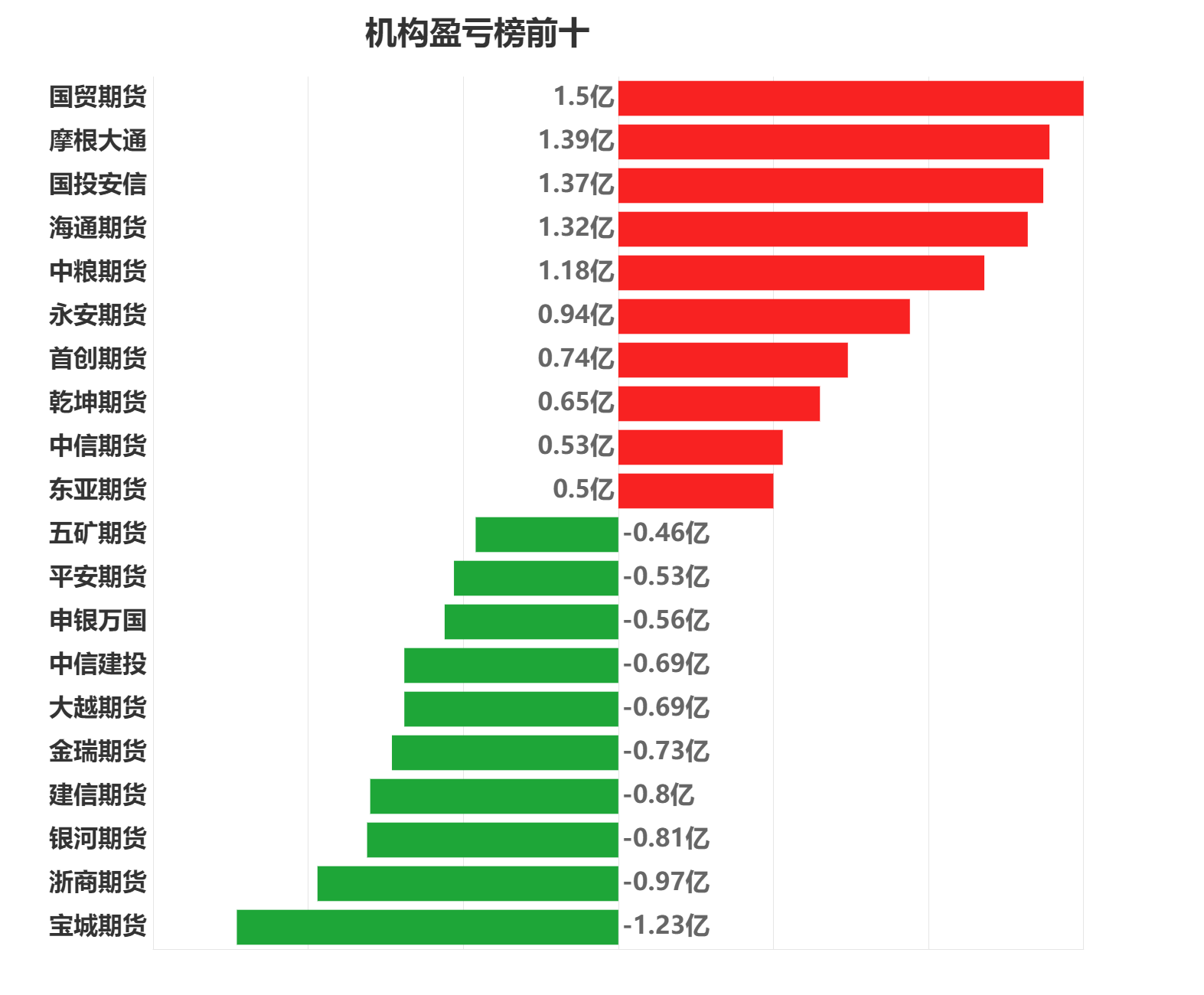 ![]() ![]() ![]() 品种盈亏榜:今日商品期货中豆油盈利第一,为0.89亿元。 橡胶亏损第一,为0.58亿元。 ![]() 就豆油而言,今日席位盈利前三为摩根大通、国投安信、中粮期货,分别盈利5163.88万元、4227.76万元、3847.85万元。 今日席位亏损前三为申银万国、五矿期货、金元期货,分别亏损3658.33万元、2398.56万元、2069.74万元。 ![]() 就橡胶而言,今日席位盈利前三为永安期货、平安期货、光大期货,分别盈利999.07万元、638.45万元、622.42万元。 今日席位亏损前三为海通期货、国投安信、浙商期货,分别亏损2221.99万元、1271.01万元、1058.74万元。 ![]() 席位盈亏榜:今日机构席位中国贸期货盈利第一,为1.50亿元。 宝城期货亏损第一,为1.23亿元。 ![]() 就国贸期货而言,今日品种盈利前三为沪银、沪镍、铁矿石,分别盈利5597.56万元、3954.43万元、1968.94万元。 今日品种亏损前三为橡胶、PTA、棕榈油,分别亏损844.92万元、677.82万元、391.08万元。 ![]() 就宝城期货而言,今日品种盈利前三为纯碱、十债、沪铝,分别盈利236.92万元、221.06万元、105.01万元。 今日品种亏损前三为铁矿石、沪铜、螺纹钢,分别亏损3954.14万元、3155.36万元、2826.88万元。 ![]() 注:可通过点击东方财富期货PC端左侧“龙虎榜”栏目及东方财富期货APP行情页面“龙虎榜”栏目查看各类机构持仓及盈亏榜单信息。 ![]() ![]() 以上图表数据来源:东方财富Choice (文章来源:东方财富研究中心) (责任编辑:admin) |