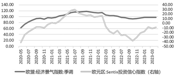 图为欧元区Sentix投资信心指数与欧盟经济景气指数