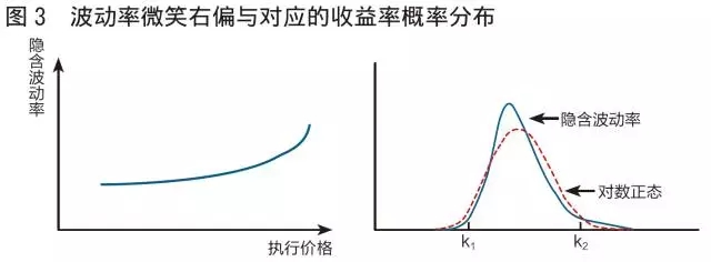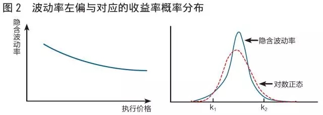 图2展示了波动率微笑的左偏形态,隐含波动率随执行价格的递增而递减,对应的收益率概率分布(右图的实线图形)与标准正态分布(右图的虚线部分,与实际收益率的概率分布具有相同均值和标准差)相比,呈现尖峰、更厚的左端尾部及更瘦的右端尾部(图2)。