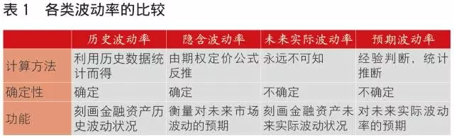 预期波动率是指运用统计推断方法对未来实际波动率进行预测得到的结果,通常被用于期权定价。因此,预期波动率是人们对期权进行理论定价时实际使用的波动率。值得注意的是,预期波动率并不等于历史波动率,因为金融资产未来波动状况可能和历史波动状况大相径庭,但历史波动率会是预期波动率的很好近似,除此之外,对预期波动率的估计还可能来自经验判断等其他方面(表1)。