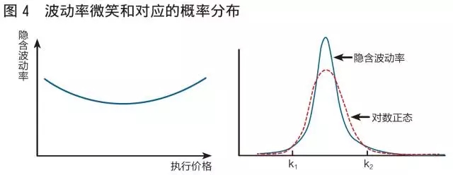 图4展示了波动率微笑的最常见形态,虚值和实值期权对应的隐含波动率被Black-Scholes模型低估,对应的收益率的概率分布与标准正态分布相比呈现尖峰和双侧厚尾(图4)。