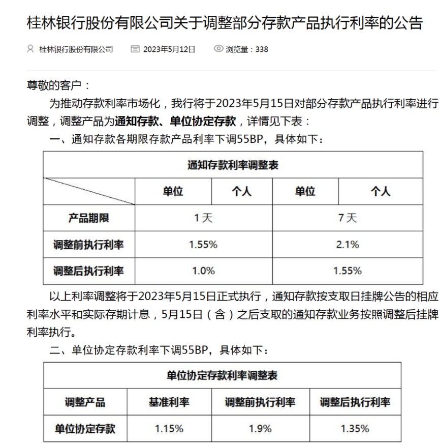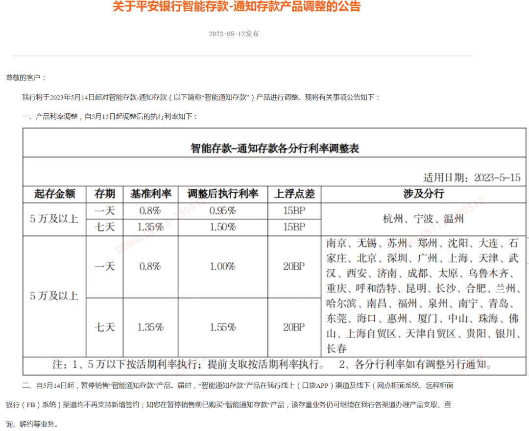 协定、通知存款自律上限调整在即,已有银行发布公告提前告知储户。5月12日,平安银行、东营银行等部分银行发布通知表示,将暂停销售“智能通知存款”类产品或办理智能通知存款业务。 据中国证券报5月13日消息,日前,记者从多家银行获悉,有关部门下发通知,自5月15日起,要求各银行控制通知存款、协定存款利率加点上限。其中,国有大行加点上限不能超过10个基点,其他金融机构不能超过20个基点。 对于两类存款自律上限调整新规,银行业券商分析师认为,对于规范协定存款定价秩序作用较大,减少存款定价的无序竞争,合力压降银行负债成本。 预计新规则会普遍降低中小行协定存款及通知存款利率,但对大行及部分股份行的影响相对很小。另外,协定存款属于对公业务,通知存款既有对公业务,也有个人业务,但都有一定的存款门槛。总体来看,协定存款和通知存款基本以对公活期存款为主,对一般老百姓的影响不大。 暂售智能通知存款产品 协定、通知存款自律上限调整在即,平安银行、东营银行等部分银行发布公告称,暂停或取消通知存款业务。 平安银行5月12日发布公告称,自5月14日起,暂停销售“智能通知存款”产品。届时,“智能通知存款”产品在平安银行线上(口袋APP)渠道及线下(网点柜面系统、远程柜面银行系统)渠道均不再支持新增签约;如客户在暂停销售前已购买“智能通知存款”产品,存量业务仍可继续在平安银行各渠道办理产品支取、查询、解约等业务。 具体来看,平安银行自5月15日起调整后的执行利率为:杭州、宁波、温州分行5万及以上起存金额1天和7天期通知存款利率调整为0.95%、1.5%,较基准利率上浮15BP;南京、无锡、苏州、郑州、沈阳、大连等分行5万及以上起存金额1天和7天期通知存款利率调整为1%、1.55%,较基准利率上浮20BP。东营银行的客服人员介绍:“下调之后的利率,1天的是1%,7天的是1.55%。之前的利率,7天的是1.7%,1天的是1.3%,下调幅度还是比较大的。” ![]() 同日,东营银行发布公告称,为贯彻落实人民银行深化利率市场化改革各项举措,按照人民银行健全市场化利率形成和传导机制有关导向要求,自2023年5月15日起,暂停智能通知存款业务办理。东营银行客服人员说:“15日开始就暂停了,之前办理是依托个人通知存款去走的。” ![]() 桂林银行也发布《关于调整部分存款产品执行利率的公告》表示,为推动存款利率市场化,该行将于5月15日对部分存款产品执行利率进行调整,调整产品为通知存款、单位协定存款。 具体来看,通知存款各期限存款产品利率下调55BP,调整后的执行利率1天期、7天期分别为1.00%、1.55%;单位协定存款执行利率下调至1.35%,也较此前的利率下调55BP。桂林银行表示,单位协定存款利率调整将于5月15日正式执行,2023年5月15日前办理的单位协定存款,超过基本存款额度的存款按照调整前后协定存款利率分段计息。 ![]() 四川天府银行称,将于2023年5月15日0时起调整人民币通知存款及协定存款产品执行利率。其中,1天通知存款执行利率为1%,7天通知存款执行利率为1.55%、协定存款为执行利率为1.35%,均较基准利率上浮20BP。 此外,新疆布尔津喀纳斯农商银行5月12日23点发布公告称,将取消个人1天、7天通知存款产品自动续存功能。公告还显示,新疆农村信用社自5月15日起,暂停网上银行、手机银行申请办理个人通知存款产品。 对百姓有何影响? 智能通知存款是银行根据客户的资金需求和风险偏好推出的一种存款产品,可以像活期存款一样灵活支取,不支取的部分可以按事先约定的期限要求自动转存为通知存款。目前,这类通知存款的起存金额基本在5万元,一般分为1天期和7天期。 所谓协定存款,一家大行客服对财联社记者介绍,单位协定存款是指企业与我行签订协定存款合同,开立银行结算账户,约定期限,并商定账户基本额度,银行对基本额度内存款按活期存款利率计息,超过基本额度的部分,按协定存款利率支付利息的一种存款。协定存款分为普通型协定存款和传统型协定存款两种。 为什么要对这两款产品的利率加点上限进行调整? 据金融时报5月12日报道,“居民超额储蓄高增、行业息差下行,在资产端定价压力较大且存款持续高增的情况下,压降存款成本成为改善息差的重要手段。”中泰证券研究所所长戴志峰认为。 戴志峰表示,今年一季度,在息差方面,银行业累计年化净息差环比下降8bp,其中资产端收益率环比下行6bp,负债端成本环比上升2bp,主要是资产端收益率环比下降,同时负债端成本也有小幅上升;在资产端,由于重定价和新发贷款利率下行,同时零售贷款投放偏弱,整体资产端定价压力较大;而在负债端,存款占比生息资产持续提升,存款占比环比提升0.9%个点至77.8%,且存款定期化趋势延续,截至2022年末个人定期存款占比环比提升1.5%,推动综合负债成本提升。 两类存款利率调整对老百姓有何影响?有市场观点认为,降息一方面有利于刺激消费以及缓和企业经营压力,但另一方面老百姓手里的存款收益缩水了,怎么看待双方观点?粤开证券分析师罗志恒表示,协定存款属于对公业务,通知存款既有对公业务,也有个人业务,但都有一定的存款门槛。总体来看,协定存款和通知存款基本上以对公活期存款为主,对一般老百姓的影响不大。对于企业来说,会有一定的利息损失,但若存贷款利率都能有所下调,也有助于刺激企业投资并降