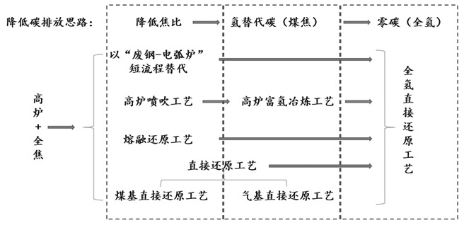 A 钢铁行业碳减排(含氢冶金)主要技术路线 以“废钢—电弧炉”短流程替代“高炉—转炉”长流程 近年来,我国处于工业化、城镇化快速发展期,钢铁需求较大,但废钢资源总体供应难以满足庞大的钢铁需求。因此,从实际出发,国内钢铁生产供应以“高炉—转炉”长流程为主,占比约为90%。然而,“高炉—转炉”长流程吨钢碳排放量为1.8—2.5吨,远超“废钢—电弧炉”短流程吨钢碳排放量0.25—0.3吨。因此,在废钢资源逐步增加、满足部分替代铁矿石进口依赖的条件下,可以“废钢—电弧炉”短流程替代“高炉—转炉”长流程,达到明显降低吨钢碳排放的目标。 高炉喷吹工艺 高炉喷吹工艺,是指通过向高炉中喷吹天然气、重油或煤粉来替代一部分焦炭的冶炼工艺,该工艺早在20世纪50年代就已经获得工业化应用,并于20世纪60年代获得推广。至于各国在高炉喷吹工艺中选择的具体燃料类型,取决于各国具体燃料类型的可经济获得性。比如,在天然气资源丰富的北美、俄罗斯、乌克兰多采用高炉喷吹天然气工艺,而在具有“富煤缺油少气”资源禀赋国家,主要以喷吹煤粉作为高炉燃料或炼铁还原剂的补充。尽管喷吹燃料可以部分产生一氧化碳、氢气参与炼铁还原反应,但其中氢含量普遍较小,对于降低焦比、节约焦炭成本有一定作用,但对降低碳排放的意义不大。 熔融还原工艺 熔融还原工艺,以奥钢联开发的COREX非焦炼铁技术为代表,由竖炉的还原和熔炼造气炉的熔融两部分组成,竖炉利用熔炼造气炉产生的煤气对铁矿石预还原,生成海绵铁,海绵铁与煤再进入熔炼造气炉进行熔炼,生成铁水和煤气。 熔融还原工艺本质上是“以煤代焦”,可以降低对焦炭的骨架作用的依赖(实际上仍需要一定量的焦炭以改善透气性和顺行),从而在不需要优质的铁矿石和焦炭的情况下,也可以冶炼出优质的铁水,但熔融还原法并没有降低对含碳燃料和碳还原方式的依赖,所以对降低碳排放的意义也非常有限。 直接还原工艺 直接还原工艺包括气基直接还原工艺和煤基直接还原工艺,前者在实际应用中更为常见。 气基直接还原工艺以还原气为还原剂,还原炉(气基竖炉)内的热量主要来自还原气的物理热,还原过程为铁矿石直接到金属铁。由于气基直接还原的还原气多由天然气裂化制取,其中氢气达55%,所以气基直接还原工艺可以实现部分氢冶金替代碳冶金的作用。 煤基直接还原工艺常见于天然气较为稀缺的国家或地区,如我国的煤基直接还原工艺有煤基隧道窑法或回转窑法,采用煤制气+还原竖炉工艺。由于煤基(竖炉)直接还原工艺仍属于碳冶金,没有实现部分氢冶金的替代,所以煤基(竖炉)直接还原工艺同样对于碳减排意义不大。 高炉富氢冶炼工艺 在上述气基直接还原工艺中,可以看到部分氢冶金替代碳冶金的影子,但气基直接还原工艺中的氢冶金技术,主要是通过气基竖炉中被天然气裂化的氢气还原反应来完成,而非通过高炉来完成。高炉富氢冶炼工艺,则是以焦炉煤气改质或天然气裂解制氢得到的还原气对高炉进行喷吹完成。 由于焦炉煤气中氢气的体积分数为55%—60%,在天然气资源不足,但焦炉煤气资源丰富的国家或地区,应用高炉富氢冶炼技术的主要思路就是通过焦炉煤气富氢冶炼,可以取得降低焦比和碳排放的较好效果。