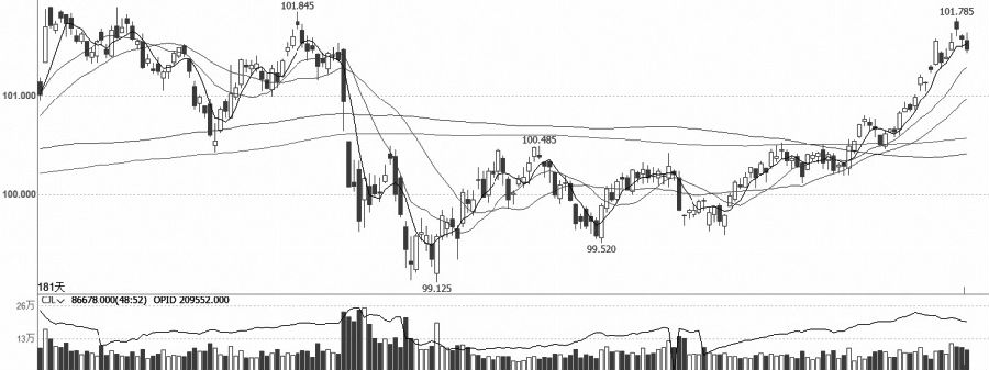 十债加权连续强势创新高,上周短调考验短期均线支撑。周一早盘小幅高开后走低,盘中维持弱势,临近尾盘仍低位运行。主连合约减仓幅度较大,远月合约加仓较多,使得总体仓位明显缩减,而成交量能较上周多数交易日明显缩减。MACD红柱开始收敛,KDJ快线自高位回落,日K线在短期均线附近调整压力较大。从技术形态上看,日K线振荡上行走势告一段落,关注近期量仓变化情况,建议多单减仓。(田瑞 期货投资咨询证编号TZ008852) (责任编辑:admin) |