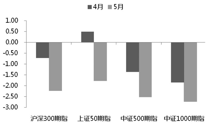 4月份以来,市场多空因素交替,期指各品种走势逐渐分化,IC及IM回落较多,IF及IH相对抗跌。国内经济复苏斜率放缓,高利率环境下欧美经济衰退风险增大,二季度期指市场上方压力不减。