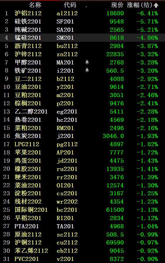 商品期货跌多涨少,沪铝大跌6%,创4个月新低;纯碱、硅铁大跌5%,锰硅跌超4%,沥青、铁矿、沪锌跌超3%;塑料、沪银、豆一涨超2%。![]()