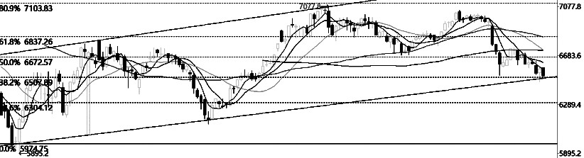 目前,IM回落至上涨通道下沿和黄金分割0.382对应的6500点的重要支撑位。均线方面,呈空头排列,显示价格趋弱。指标方面,MACD指标死叉后没有金叉和底背离的迹象,说明下跌趋势未改;KDJ指标、RSI指标则有金叉迹象,说明短期存在反弹需求。量仓方面,近期IM的下跌伴随着减仓缩量,说明行情很大程度上是多头止损所致,下跌动能不足。综合分析判断,IM向下有效突破的难度较大,短期有望超跌反弹。操作上,前期空单适量止盈,空仓者背靠6500点轻仓试多。 五债 临近上沿