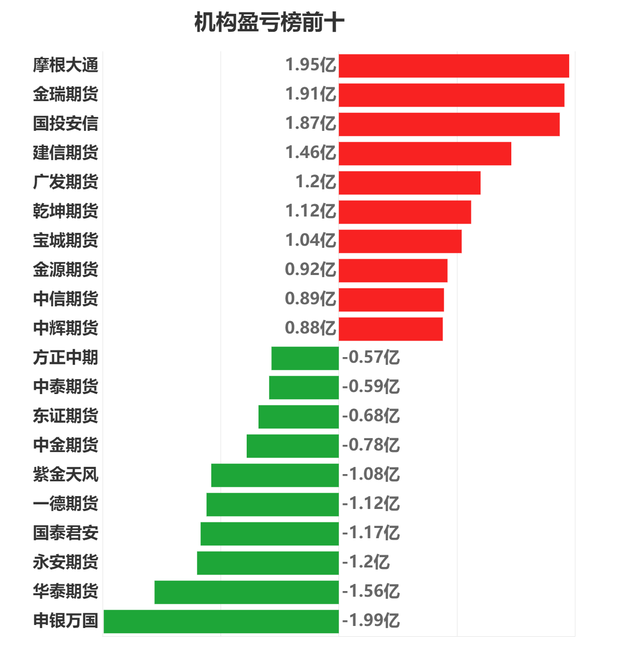 每日市场龙虎榜,带你深度了解市场。 市场一览:周四商品期货综合指数上涨0.48%,日内资金净流入17.01亿元。 市场成交量为3270.21万手,成交额为1.87万亿元。 持仓量为3938.92万手,较前一交易日增加14.03万手。 市场成交量前十和持仓量前十如下图所示: ![]() ![]() ![]() 品种盈亏榜:今日商品期货中沪铜盈利第一,为1.51亿元。 玻璃亏损第一,为1.68亿元。 ![]() 就沪铜而言,今日席位盈利前三为金瑞期货、建信期货、金源期货,分别盈利16624.75万元、10018.47万元、8176.31万元。 今日席位亏损前三为永安期货、五矿期货、国投安信,分别亏损6034.40万元、5793.55万元、4518.98万元。 ![]() 就玻璃而言,今日席位盈利前三为中信期货、国投安信、徽商期货,分别盈利6019.79万元、5186.23万元、3876.27万元。 今日席位亏损前三为国泰君安、紫金天风、浙商期货,分别亏损11268.78万元、6657.54万元、6520.57万元。 ![]() 席位盈亏榜:今日机构席位中摩根大通盈利第一,为1.95亿元。 申银万国亏损第一,为1.99亿元。 ![]() 就摩根大通而言,今日品种盈利前三为沪深、豆油、菜油,分别盈利6080.43万元、5849.09万元、4363.37万元。 今日品种亏损前三为中证1000股指、菜粕、花生,分别亏损1479.06万元、637.68万元、623.15万元。 ![]() 就申银万国而言,今日品种盈利前三为沪铜、中证1000股指、铁矿石,分别盈利2992.12万元、1917.23万元、1790.78万元。 今日品种亏损前三为沪深、玻璃、豆油,分别亏损6917.02万元、3380.66万元、3283.26万元。 ![]() 注:可通过点击东方财富期货PC端左侧“龙虎榜”栏目及东方财富期货APP行情页面“龙虎榜”栏目查看各类机构持仓及盈亏榜单信息。 ![]() ![]() 以上图表数据来源:东方财富Choice (文章来源:东方财富研究中心) (责任编辑:admin) |