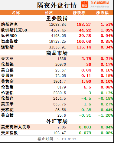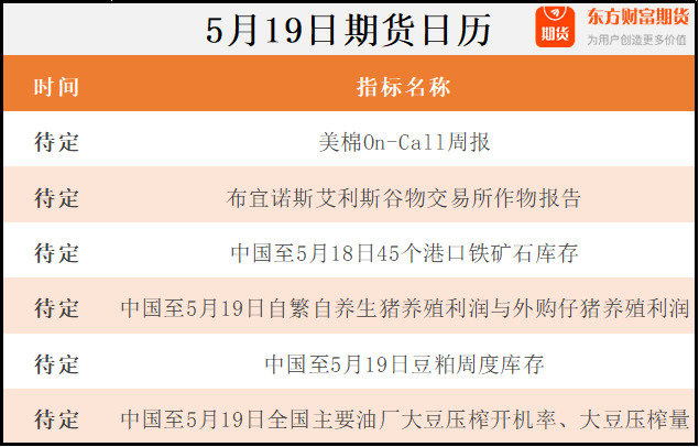外盘收报![]() 每日精选深夜“放鹰”!联储票委最新表态,加息概率飙升! 楼市“动力”不足,杭州、南京等热点二线城市局部放松限购 多晶硅价格较去年高位已“腰斩”,硅料价格底部空间在哪? 宏观产经央视网:5月17日至18日,中共中央政治局常委、国务院总理李强在山东调研。他强调,加快建设以实体经济为支撑的现代化产业体系,采取更有针对性措施扩内需稳外需,努力推动经济运行持续回升向好。 新华社:5月18日,上午9点,国家金融监督管理总局在北京金融街15号正式揭牌。这意味着,运行了5年的银保监会正式退出历史舞台。组建国家金融监督管理总局,优化和调整金融监管领域的机构职责,对于加强和完善现代金融监管,解决金融领域长期存在的突出矛盾和问题,具有十分重要的意义。 财联社:美国上周首次申领失业救济人数为24.2万人,预估为25.1万人,前值为26.4万人。 品种资讯黑色系&金属期货 钢材:本周,钢材总库存量1794.49万吨,环比降77.99万吨。其中,钢厂库存量511.29万吨,环比降30.94万吨;社会库存量1283.2万吨,环比降47.05万吨。(Mysteel) 截至5月18日当周,社库连续第十二周减少,产量连续第五周减少,厂库连续第二周减少,表需由增转降。(Mysteel) 铁矿石:华菱钢铁在投资者互动平台表示,供给端看,2023年是铁元素供给增加较多的一年,印度矿供应恢复,四大矿山供应有增量,国内废钢供应好转,加之国家政策层面对大宗原材料炒作监管愈发严格,预计2023年铁矿石均价将较2022年中枢下移,全年呈现前高后低震荡走势。(每日经济新闻) 焦炭:据焦联资讯,5月18日国内焦炭市场暂稳运行。河北地区部分钢厂意向对焦炭采购价格下调50元/吨。据悉,此前七轮幅度基本为100元/吨。(新华财经) 有色:伦敦金属交易所(LME):铝库存减少2450吨,铜库存增加3900吨,镍库存减少24吨,铅库存增加325吨,锡库存持平,锌库存增加275吨。 铜:5月18日,上海有色网铜现货平均成交升贴水较前一交易日上涨190元,至升水425元/吨;现货市场可流通货源偏紧,升水大幅走高,但华东、华南市场成交依旧积极,华北市场交投不及前一日。(新华财经) 锌:国际铅锌研究小组(ILZSG)公布的数据显示,2023年3月,全球锌市供应过剩量增至26700吨,2月为供应过剩22800吨。2023年1—3月,全球锌市供应过剩49000吨,2022年同期为供应过剩116000吨。(新华财经) 农产品期货 农产品:俄罗斯总统普京表示,俄罗斯是全球农产品的重要供应商之一,俄罗斯农产品出口将继续保持这种发展态势,预计2022至2023年度的谷物产品出口量将达到5500至6000万吨。(财联社) 克里姆林宫确认将黑海谷物协议延长两个月,粮食协议谈判取得了“合格的结果”。(财联社) 大豆:本月预测,2023/24年度中国大豆种植面积10443千公顷(1.57亿亩),较上年度增加2.0%;大豆单产达到每公顷2055公斤(每亩137公斤),较上年度增长3.8%;大豆产量达到2146万吨,较上年度增加6.0%。(农业农村部) 玉米:本月预测,2023/24年度,中国玉米种植面积43470千公顷(6.52亿亩),较上年增加400千公顷(600万亩),增幅0.9%。(农业农村部) 棕榈油:本周国内沿海地区棕榈油库存连续第七周下降。5月17日,沿海地区食用棕榈油库存56万吨(加上工棕65万吨),周环比减少8万吨,月环比减少20万吨,同比增加33万吨。4-5月到港量减少导致棕榈油去库进度加快,下游多随用随采,基差相对稳定。(国家粮油信息中心) 棉花:本月预测,2023/24年度中国棉花种植面积为2872千公顷(4308万亩),较上年度减少128千公顷(192万亩);棉花播种期天气较常年偏好,单产调增1%至2012公斤/公顷;棉花产量为578万吨,较上年度下降20万吨;进口为185万吨,较上年度保持一致;经济增长恢复拉动棉花需求,棉花消费量为772万吨,较上年度增加2.9%。 (农业农村部) 白糖:近日,农业农村部发布2023年5月中国农产品供需形势分析。其中,关于食糖的分析提到:本月,2022/2023年度中国食糖生产全部结束,食糖产量小幅调减至896万吨;食糖进口成本持续上涨,国内食糖均价上调至6150元-6550元/吨。(新京报) 能化期货 燃油:新加坡企业发展局(ESG):截至5月17日当周,新加坡燃油库存下降2.1万桶,至1917.3万桶的六个月低点。(新华财经) 玻璃:截至5月18日当周,全国浮法玻璃日产量为16.22万吨,环比减少0.55%;产量113.53万吨,环比增加0.11%,同比减少5.19%;行业开工率79.61%,环比增加0.33%;产能利用率为80%,环比下降0.44%。(隆众资讯) 纯碱:国内纯碱厂家总库存54.42万吨,环比增加1.86万吨,上涨3.54%,库存整体变化不大,窄幅增加。纯碱产量58.73万吨,环比下降2.2万吨,下降3.61%;整体开工率87.33%,环比下降3.86%。其中,江苏实联、徐州丰成、重庆湘瑜停车以及氨碱源负荷下降。(隆众资讯) 甲醇:截至5月18日,甲醇企业开工率为71.77%,环比上期降2.4%;企业库存为36.26万吨,环比上期增0.07万吨。(隆众资讯) 聚酯:本周聚酯链各环节开工率多数提升,PTA、短纤环比增幅相对明显。乙二醇开工环比下滑,卫星石化、陕煤渭化、新疆天业等陆续检修,上周陕西榆林化学装置临时停车。终端方面,近期市场步入淡季迹象凸显,织造纺织市场气氛转弱,市场对于后续新单衔接信心不足。(隆众资讯) LPG:隆众资讯最新数据显示,截至5月18日当周,中国液化气港口样本库存量为210.62万吨,较上期减少2.51万吨或1.18%。(隆众资讯) 尿素:截至5月18日当周,国内尿素企业周度开工率环比下降0.9%至80.18%,企业库存环比减少3.17万吨至100.57万吨。近期检修企业数量逐步增