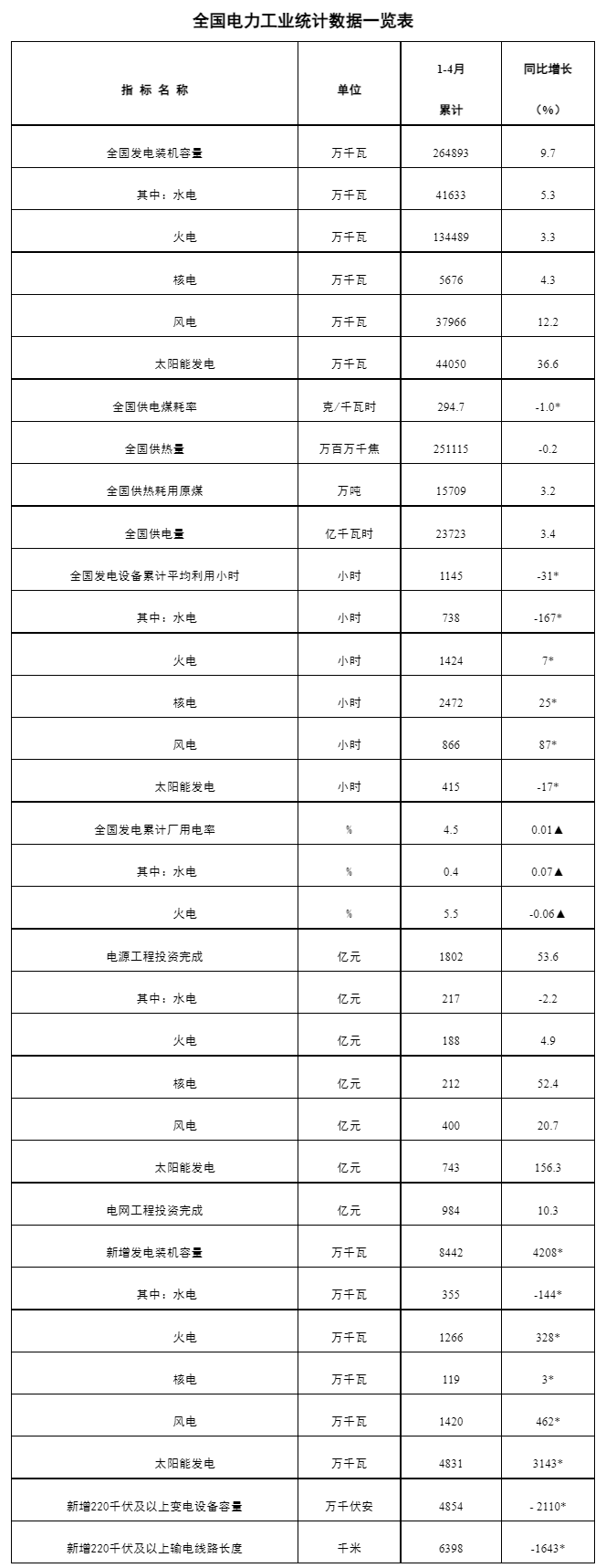 5月19日,国家能源局发布1-4月份全国电力工业统计数据。 截至4月底,全国累计发电装机容量约26.5亿千瓦,同比增长9.7%。其中,风电装机容量约3.8亿千瓦,同比增长12.2%;太阳能发电约4.4亿千瓦,同比增长36.6%。 1-4月份,全国发电设备累计平均利用1145小时,比上年同期减少31小时。其中,水电738小时,比上年同期减少167小时;太阳能发电415小时,比上年同期减少17小时;风电866小时,比上年同期增加87小时;核电2472小时,比上年同期增加25小时;火电1424小时,比上年同期增加7小时。 1-4月份,全国主要发电企业电源工程完成投资1802亿元,同比增长53.6%。其中,太阳能发电743亿元,同比增长156.3%;核电212亿元,同比增长52.4%。电网工程完成投资984亿元,同比增长10.3%。 ![]() 注:1.全社会用电量为全口径数据,全国供电量为调度口径数据。2.“同比增长”列中,标*的指标为绝对量;标▲的指标为百分点。 (文章来源:国家能源局) (责任编辑:admin) |