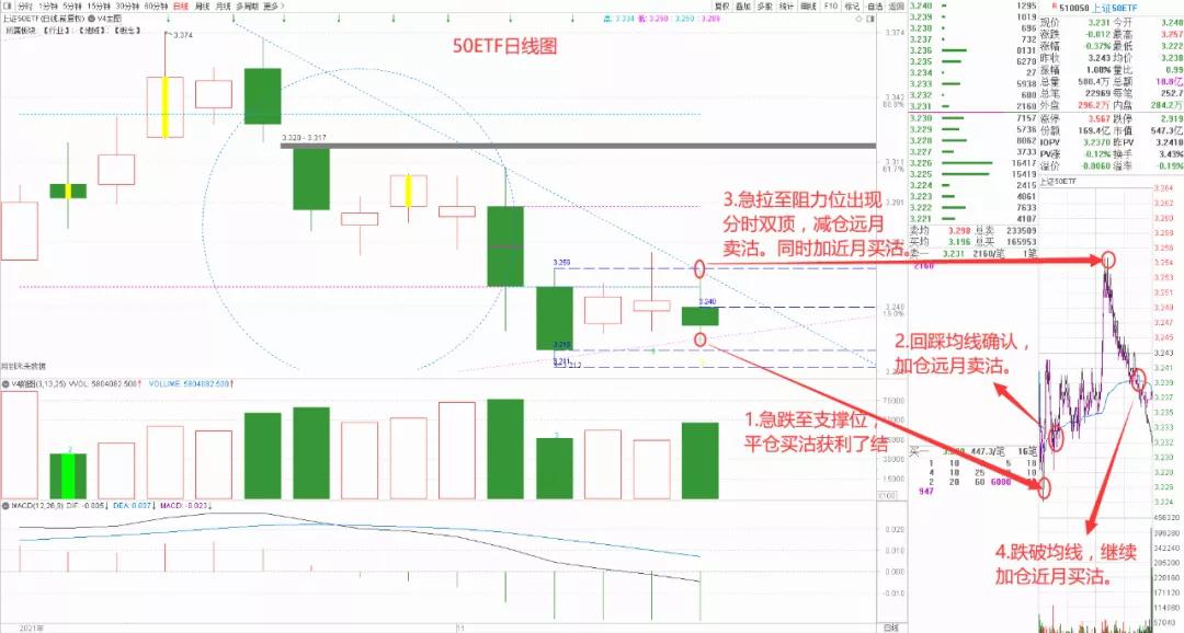 标的50ETF今天在支撑位(上升通道下沿)和压力位(下跌趋势线)之间窄幅震荡,日线级别的高点和低点相比上一个交易日均有降低。盘中没有特别明显的趋势性机会,只能在控制仓位的前提下做了几把日内T+0,收盘时仍然是熊三腿的持仓结构(远月卖宽跨、近月买沽),仓位2成左右。标的短线即将选择方向,需要强调的是,在“确认”走强之前,我手中的保险仓位是不会轻易丢掉的。 下面贴几张截图,不做过多说明,对期权有一定了解或者长期关注本公众号的朋友,自然明白我想表达什么。