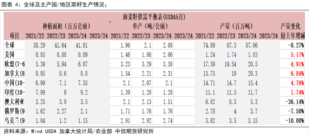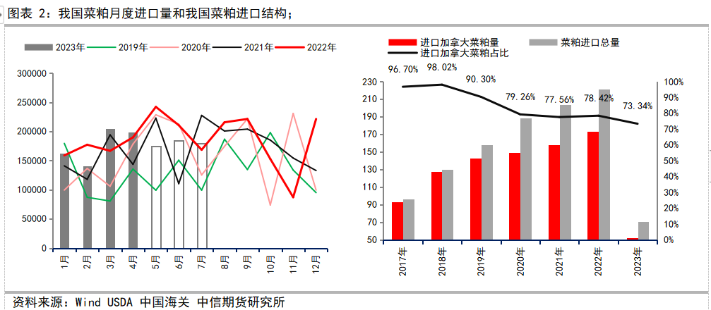 全球2022/2023年度菜籽丰产基本确定,2023/2024年度全球菜籽产量预期稳中略降。USDA5月供需报告显示,预计2022/2023年度全球菜籽产量为8730万吨,同比增加16.57%。其中,加拿大、欧盟、澳大利亚、俄罗斯等为主要增产国/地区。从我国菜系进口来源地看,加拿大、欧盟、俄罗斯等国家/地区的增产有利于我国菜系进口的增加。例如,2023年1-3月加拿大对中国菜籽出口大幅增加至150万吨(上年同期仅为30万吨),对华菜籽出口占加拿大菜籽出口总量的63%(上年仅为24%)。另外,尽管受小麦装船大幅增加220万吨至1010万吨,导致2023年1-3月澳大利亚菜籽出口总量仅为190万吨,同比减少14%,但因澳大利亚菜籽丰产(2022/2023年度澳大利亚菜籽产量达830万吨,同比增加21.7%),截至3月末澳大利亚菜籽库存达到创纪录的430万吨,较上年增加100万吨。预计2023年4-9月澳大利亚菜籽出口将持续上升,2022/2023年度澳大利亚菜籽结转库存或至少在创纪录的100万吨。而2023年5月中旬澳大利亚贸易部长访华释放出一些积极信号,若后期我国放开进口澳大利亚菜籽,这也将对国内菜系市场构成较大利空。 全球新季菜籽产量预期稳中略降,但预计对我国进口影响较小。USDA5月供需报告预计2023/2024年度全球菜籽产量为8706万吨,同比略减0.27%。其中,主要减产国为澳大利亚,预计其2023/2024年度菜籽产量为530万吨,同比减少36.14%。从减产原因看,主要是单产的下降。即在厄尔尼诺影响下澳大利亚发生干旱的概率较大,这将对菜籽单产带来较大不利影响。而近年我国对澳大利亚菜籽进口较低,故其菜籽减产对我国进口来源的影响较小。我国菜系主要进口来源国加拿大新季菜籽产量预期为2030万吨,同比增加6.84%。因此,目前看海外新季菜籽产量预期仍将利于保证我国菜籽进口的来源。