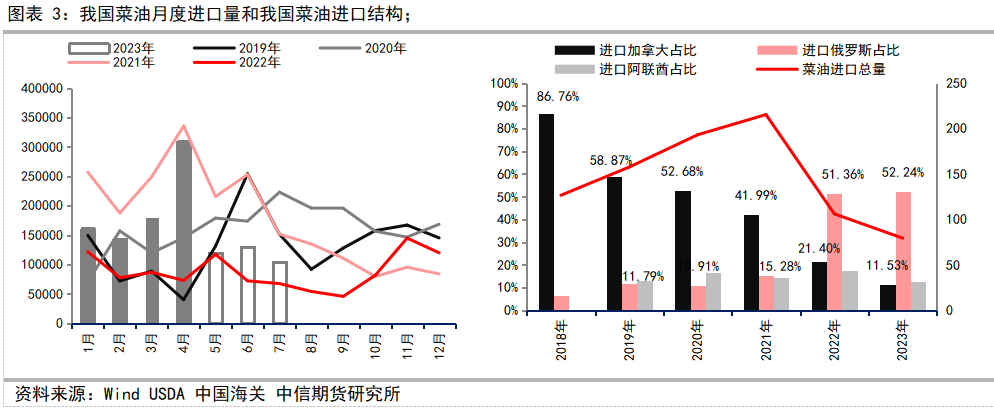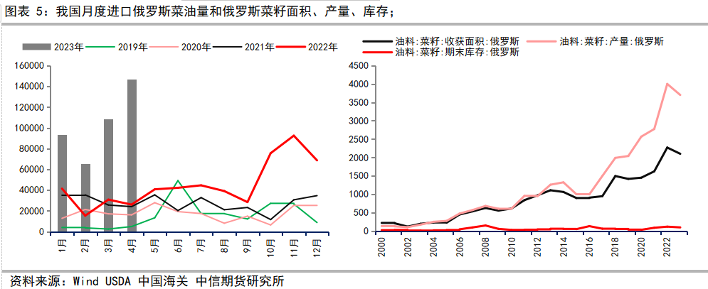 三、俄罗斯菜油对我国菜油进口冲击较大 2022年4季度以来,我国进口俄罗斯菜油量明显增加,这对我国菜系供应带来了较大冲击。根据海关数据显示,2022年10月至2023年4月我国累计进口俄罗斯菜油65.16万吨(同比增加242.77%),占此期间我国菜油进口总量的57.14%。受菜籽种植效益较好及地缘政治关系的影响,近年俄罗斯菜籽产量持续增加。USDA数据显示2022年俄罗斯菜籽产量为400万吨,同比增加近44%。由于俄罗斯以出口菜油为主,故其菜籽的增产主要体现在菜油出口量的增加。USDA预计2022/2023年度俄罗斯菜油出口量为112.5万吨,同比增加32.35%。且受地缘政治关系影响,俄罗斯菜油以出口至中国为主。这意味着今年我国进口俄罗斯菜油量或达100万吨,同比增幅近50%。新季俄罗斯菜籽产量虽有减少,但基本在正常波动范围内。USDA预计2023/2024年度俄罗斯菜籽产量为370万吨,较上年度减少30万吨(减幅7.5%)。