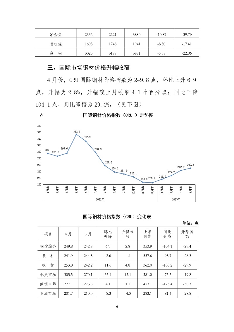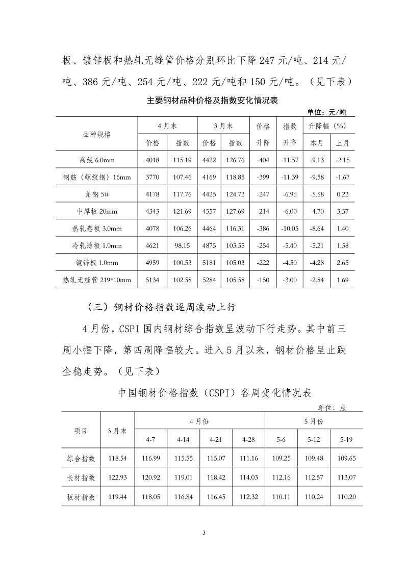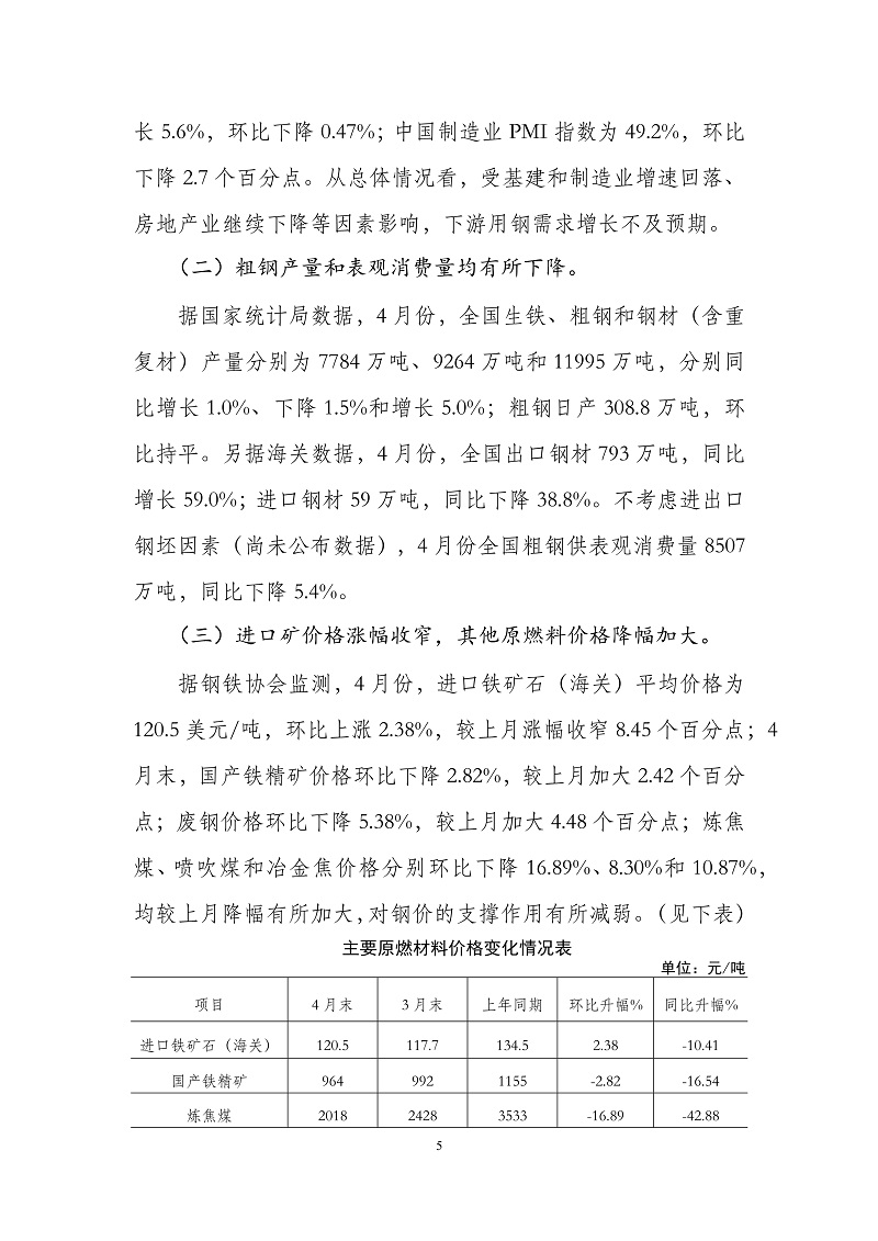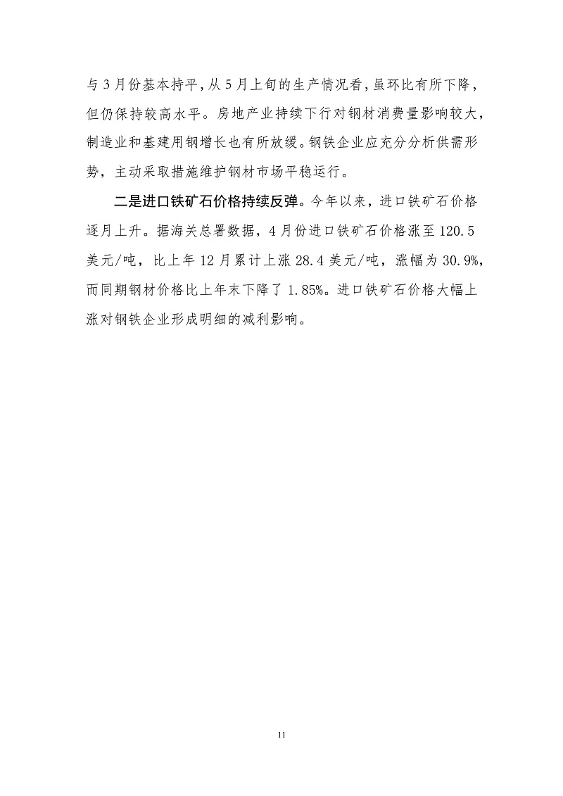 中钢协表示,4月份全国粗钢日产量与3月份基本持平,从5月上旬的生产情况看,虽环比有所下降,但仍保持较高水平。房地产业持续下行对钢材消费量影响较大,制造业和基建用钢增长也有所放缓。钢铁企业应充分分析供需形势,主动采取措施维护钢材市场平稳运行。今年以来,进口铁矿石价格逐月上升。据海关总署数据,4月份进口铁矿石价格涨至120.5美元/吨,比上年12月累计上涨28.4美元/吨,涨幅为30.9%,而同期钢材价格比上年末下降了1.85%。进口铁矿石价格大幅上涨对钢铁企业形成明细的减利影响。 ![]() ![]() ![]() ![]() ![]() ![]() ![]() ![]() ![]() ![]() ![]() (文章来源:中国钢铁工业协会) (责任编辑:admin) |