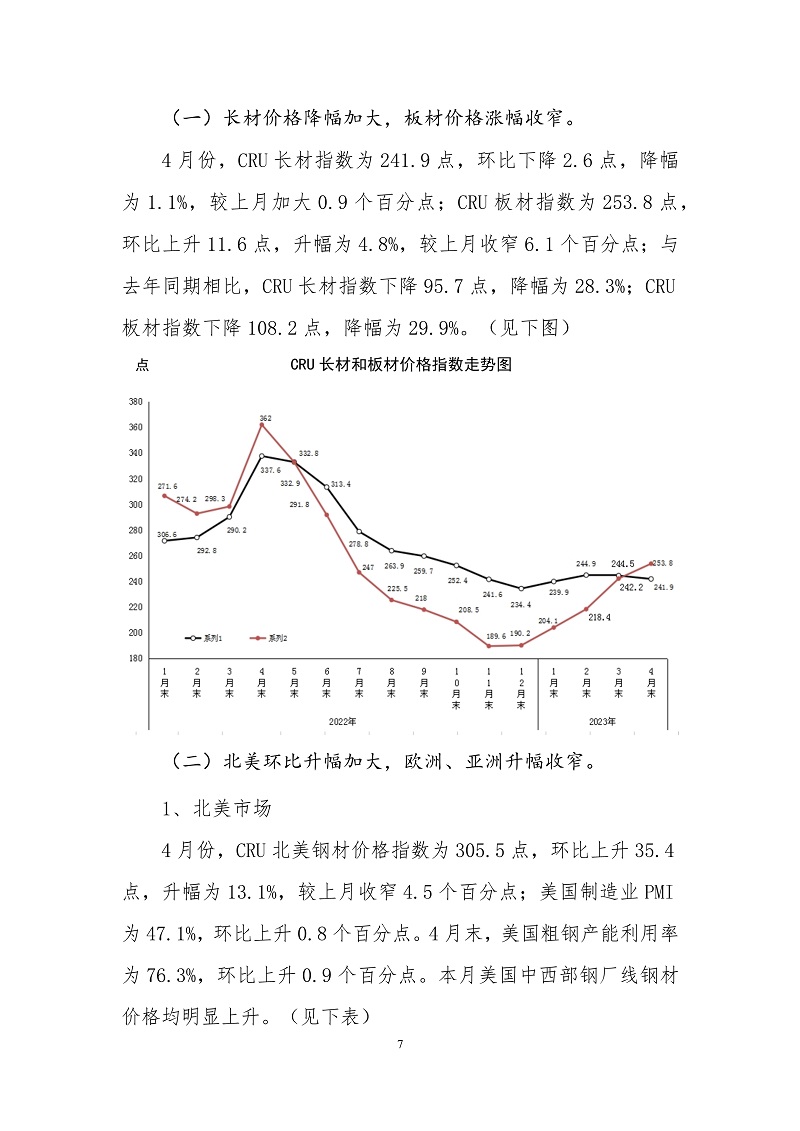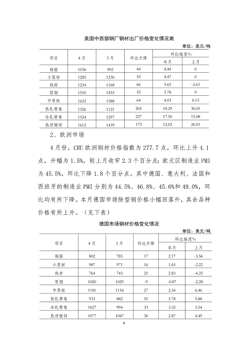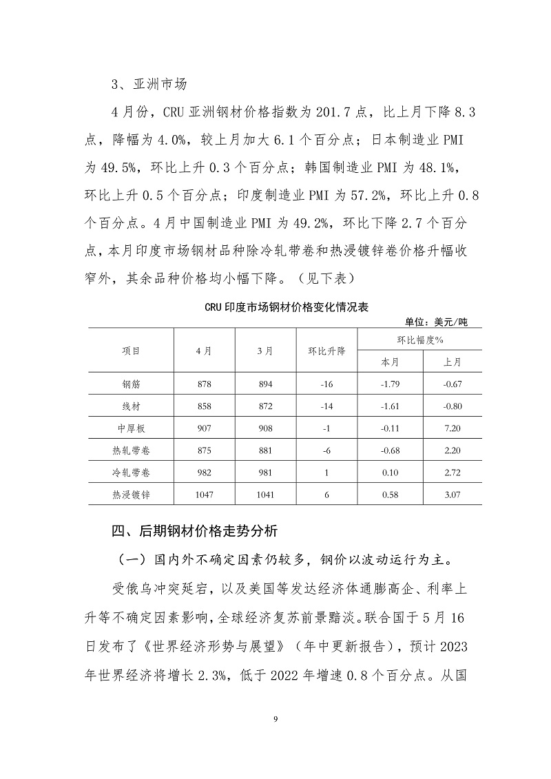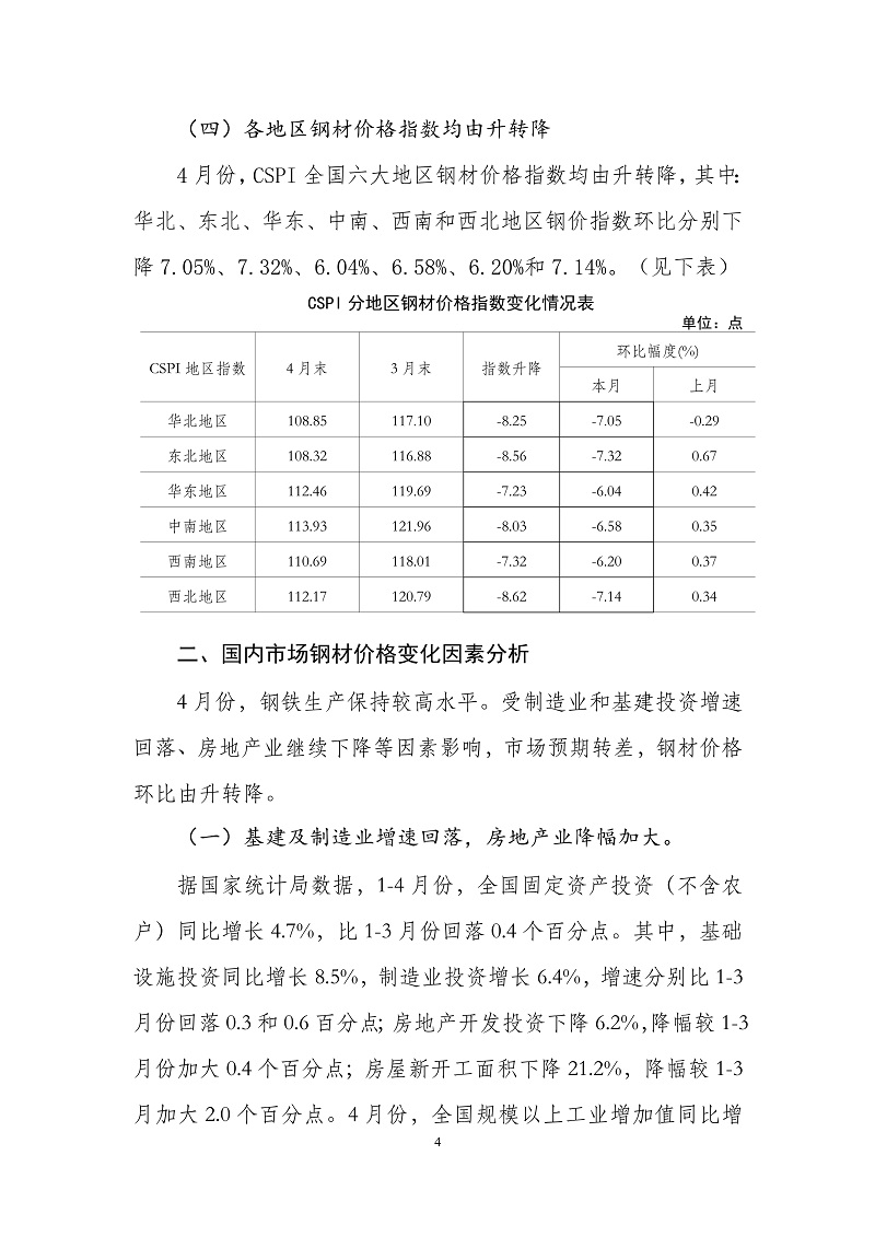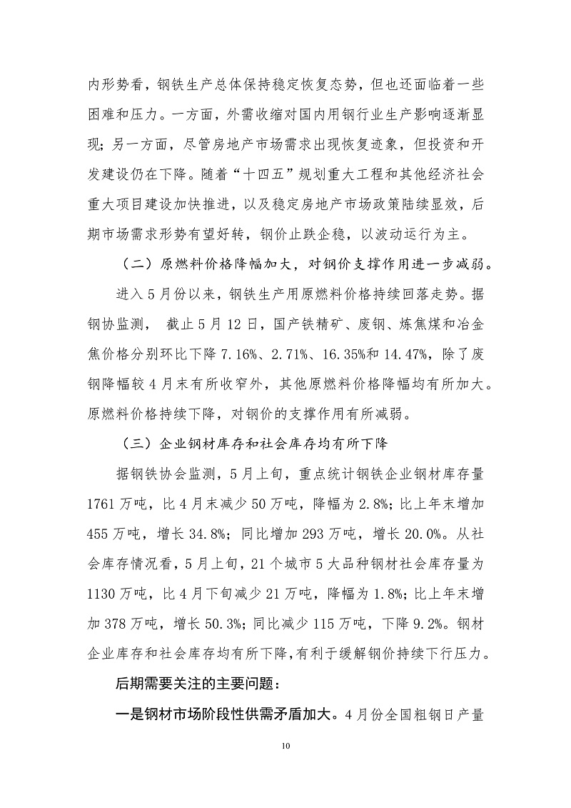 中钢协表示,4月份全国粗钢日产量与3月份基本持平,从5月上旬的生产情况看,虽环比有所下降,但仍保持较高水平。房地产业持续下行对钢材消费量影响较大,制造业和基建用钢增长也有所放缓。钢铁企业应充分分析供需形势,主动采取措施维护钢材市场平稳运行。今年以来,进口铁矿石价格逐月上升。据海关总署数据,4月份进口铁矿石价格涨至120.5美元/吨,比上年12月累计上涨28.4美元/吨,涨幅为30.9%,而同期钢材价格比上年末下降了1.85%。进口铁矿石价格大幅上涨对钢铁企业形成明细的减利影响。 ![]() ![]() ![]() ![]() ![]() ![]() ![]() ![]() ![]() ![]() ![]() (文章来源:中国钢铁工业协会) (责任编辑:admin) |
