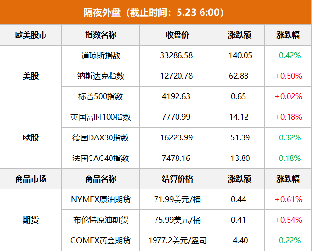 美股:道指收跌0.42%,报33286.58点;纳指收涨0.50%,报12720.78点;标普500指数收涨0.02%,报4192.63点。 欧股:德国DAX 30指数收跌0.32%,报16223.99点。法国CAC 40指数收跌0.18%,报7478.16点。英国富时100指数收涨0.18%,报7770.99点。 亚太股市:5月22日,香港恒生指数收涨1.17%,报19678.17点;恒生科技指数收涨2.14%,报3903.58点。日经225指数收涨0.86%,报31073.50点。韩国KOSPI指数收涨0.70%,报2555.58点。 人民币:在岸人民币兑美元北京时间03:00收报7.0308,较上一交易日夜盘收盘跌168点。 黄金:COMEX 6月黄金期货结算价收跌0.22%,报1977.2美元/盎司。 原油:WTI 7月原油期货收涨0.61%,报71.99美元/桶;布伦特原油期货收涨0.54%,报75.99美元/桶。 财联社:截止周一收盘,日经225指数上涨0.9%,收盘进一步创下了33年以来的最高位31086.82点。随着通胀回升、股东回报改善以及股神巴菲特的连年买入,共同增强了这一全球第三大股票市场的吸引力,日股眼下已经强势突破了被日本国内民众戏称为“铁棺材板”的三万点大关。 财联社:据报道,白宫与共和党谈判代表已同意撤回美国未用完的新冠疫情相关资金,这是正在进行中的债务上限谈判的一部分。双方还同意将能源行业许可制度改革纳入一项协议。众议院议长麦卡锡早些时候告诉记者,目前还没有达成任何共识。 第一财经:美国财政部周一发行的3个月期国库券的中标收益率创下逾20年来最高水平,因如果国会未能按时提高债务上限将导致违约风险上升,并且市场对美联储加息预期增强。财政部发行的570亿美元3个月期国库券的中标收益率为5.25%。 高盛:我们认为油市过于悲观,预计自6月份起,随着欧佩克+减产措施完全实施并需求进一步上升,将会持续出现供应不足。 美联储戴利:将密切关注所有即将到来的经济数据;当前不便透露美联储会在6月会议上采取何种行动;希望见到最核心的通胀指标进一步回落;信贷收紧的程度可能相当于“几次”加息;很难找出当前拖累美国经济增速的元凶;需要留意货币政策的延迟影响可能随时显现。 摩根大通CEO戴蒙:美国地区性银行在发布一季度财报时表现“尚属良好”;私人信贷可能存在偏离大环境的个例;无论在加息还是降息周期中,总有一些资产会与市场大势有所偏离;所有人都需要为美联储之后进一步的加息做好准备。 美联储博斯蒂克:美联储已经采取了大量的紧缩行动,但政策行动的效果存在延迟;乐于对经济进一步走向状况继续观望一段时间;在每次政策会议上都会评估经济前景。 欧洲央行管委De Cos:政策紧缩行动正在稳步推进,但仍未抵达终点;加息对通胀的打压影响将在2024年最大化;在相当长时间内利率仍将持于紧缩水平。