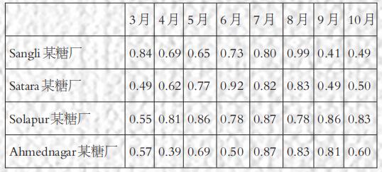 图为研究区域内NDVI指数季节性 研究方法上,我们可以根据NDVI的特征值来筛选研究区域,然后分析区域内的植被指数与单产的相关性。马邦是印度第二大产糖省,并且近几年来印度食糖的减产主要集中在马邦,所以选择马邦作为主要的研究区域。马邦的甘蔗种植主要集中在Solapur、Ahmednagar、Satara、Sangli这几个区域,产量在马邦中的占比分别为16.74%、14.08%、10.03%、9.18%。根据植被指数的特征值,选择这四个区域中糖厂附近的一些甘蔗地,结果是植被指数的季节性与甘蔗的生长特征较为吻合。然后,分析研究区域内植被指数与印度甘蔗单产之间的相关性,可以发现,NDVI指数与印度甘蔗单产之间具有较好的相关性,时间点是4—10月。因此,我们可以在榨季开始前通过NDVI指数有效预估印度甘蔗单产。