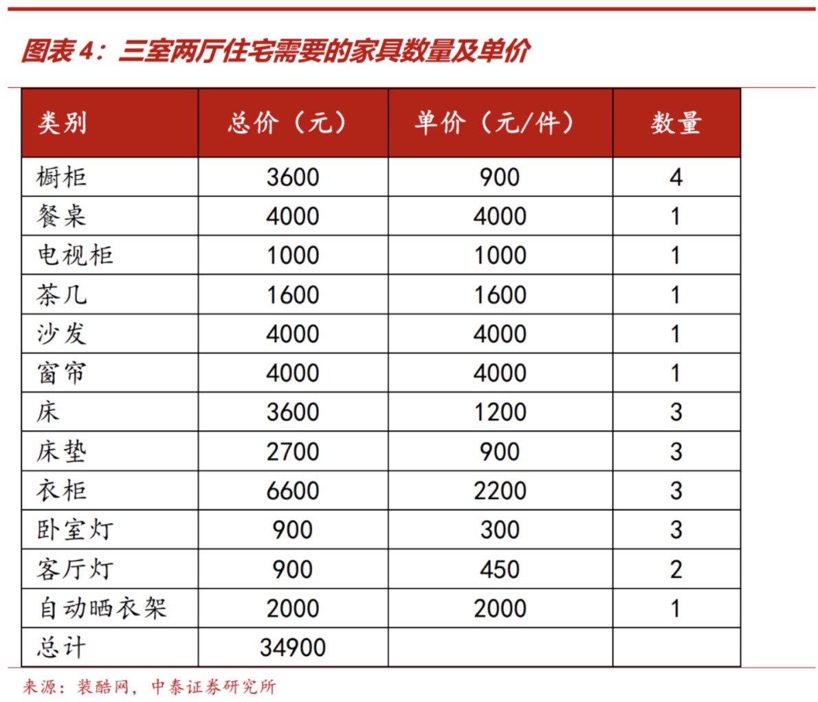 2023年房地产调控的重点工作之一是保交楼,商品房交付后会带动家电、家具和建筑建材等地产后周期商品的消费。在消费整体低迷的背景下,保交楼将为消费贡献有益增量。定量测算显示,2021年三季度至2022年年末,全国约有2.7亿平方米的商品房延期交付。假定都能交付,装修需求有望带动家电、家具、建筑及装潢材料销售额共计3247亿,占2022年社会消费品零售总额的0.7%。乐观情况下,尽管总量拉动有限,但对家具、建筑和装潢材料两个细分品类的拉动明显。 1、有多少商品房延期交付? 从历史数据看,新开工面积(12MA,即12个月移动平均)同比,领先于竣工面积(12MA)同比3年左右,这一规律在2016年到2021年二季度成立。 2021年三季度房企融资环境明显收紧,房地产开发资金来源同比从当年二季度的11.4%,大幅下滑至-8.4%。这是2015年二季度以来,继受疫情冲击最严重的2020年一季度(-13.8%)之后,房地产开发资金来源同比第二次转负。 它的影响立竿见影,整个行业的融资转紧后地产施工和竣工放慢。2021年三季度开始,应竣工但实际未竣工的商品房面积持续累积,体现在数据上就是竣工面积(12MA)同比,和滞后三年的新开工面积(12MA)同比之间的缺口不断走阔,直到2023年才开始收敛。 ![]() 利用新开工面积同比、竣工面积同比之间的领先滞后关系测算,2021年三季度到2022年年末,约有2.7亿平方米的商品房延期交付。 2022年7月全国房地产行业发生事件性冲击,此后“保交楼”成为房地产领域的重点工作。2022年7月政治局会议指出“压实地方政府责任,保交楼、稳民生”。2022年12月中央经济工作会议指出“扎实做好保交楼、保民生、保稳定各项工作”,将“保交楼”放在房地产调控工作的首位。2023年4月政治局会议再次强调“做好保交楼、保民生、保稳定工作”。 围绕“保交楼”所需资金,也出台了一系列政策。2022年8月政策性银行设立2000亿元保交楼专项借款。2022年11月央行推出2000亿元“保交楼”贷款支持计划,房企的信贷、债券和股权融资“三箭齐发”。 “保交楼”相关政策取得了一定成效。考虑到基数影响后,从两年平均同比看,今年3-4月新开工面积、施工面积的同比跌幅均持续扩大,而竣工面积两年平均同比从1-2月的-1.3%,回升至3-4月的5.6%和10.1%。竣工是房地产产业链目前为数不多的亮点。 2、定量测算“保交楼”对社消的影响 商品房竣工和交付后,需要装修、布置家具和家电,因此会带动建筑装潢材料、家具和家电等的消费。从数据上看,剔除了价格因素(用各行业的RPI同比来剔除)后的限额以上家电音像、家具、建筑及装潢材料类的零售额同比,走势都具有一定同步性,相关系数分别为0.51、0.55和0.60。 ![]() 其中,建筑及装潢材料类零售额同比和竣工面积同比的相关性最高,源于商品房交付后的装修需求相对刚性。而家电音像类零售额同比和竣工面积同比的相关性较低,可能原因是家电零售不仅有新装修需求,也包含了存量家电的更新置换需求。 我们的测算思路是,假定2.7亿平方米延期交付的商品房都能竣工和交付,先计算对家电、家具、建筑装潢材料的拉动,最后再加总。 需要明确的是,“保交楼”主要由地方政府主导,在实际操作时普遍面临地方政府财力受限、房地产纾困基金多有收益率考核要求、问题项目的资产和负债核算难度均较大、地方政府“保交楼”和开发商“要生存”的目标之间存在冲突等困难。因此,我们的定量分析结果是最乐观的情形,会高估“保交楼”对社消的实际拉动规模。 2.1 家电 我们主要测算延期交付的商品房中,住宅部分装修所引致的家电需求,纳入测算的家电包括空调、冰箱、洗衣机、彩电、淋浴热水器、油烟机和微波炉这七大类。测算思路如下: 首先,2.7亿平方米延期交付的商品房,对应着170.8万套住宅。商品房除住宅外,还包括办公楼、商业营业用房这两大类,上述家电主要用于住宅的装修,因此需要重点分析商品房中的住宅部分。2020年(最近的、未出现大面积延期交付的年份)住宅竣工面积占商品房竣工面积的72.3%,假定延期交付的商品房中也是该比例,可估算得约有1.95亿平方米住宅延期交付。2021年(最新数据)销售的住宅套均面积为114.3平米,因此约有170.8万套住宅延期交付。 其次,每套商品房装修需要的家电量,援引国家统计局公布的2021年(最新数据)城镇居民每百户耐用品拥有量。 最后,取国家发改委公布的2023年1-4月36个大中城市日用工业消费品均价,作为装修时各类家电购买的单价。 ![]() 测算结果显示,每套住宅装修需要的前述七大类家电约为1.94万元,170.8万套住宅将带动七大类家电销售约331.8亿(2019年全国地产精装修房渗透率为32%,由于房企集中采购家电的成本更低,测算结果可能高估)。奥维云网的预测显示,上述七大类家电占2023年全品类家电销售额的74%,根据该比例可推算得延期交付住宅有望带动家电零售448.3亿,约占2022年限额以上家用电器和音像器材类零售额的5.0%(假定家电销售大部分来自于限额以上零售企业)。 2.2 家具 我们采用两种方法估算每套住宅装修所需的家具金额,取两种方法的均值,以此为基础估算延期交付住宅装修所带动的家具销售额。 方法一是参考装酷网给出的装修家具清单及单价,大致推算出一套100多平方米的三室两厅住宅装修所需的家具在3.5万元左右。 ![]() 方法二是根据限额以上家具零售额、住宅竣工