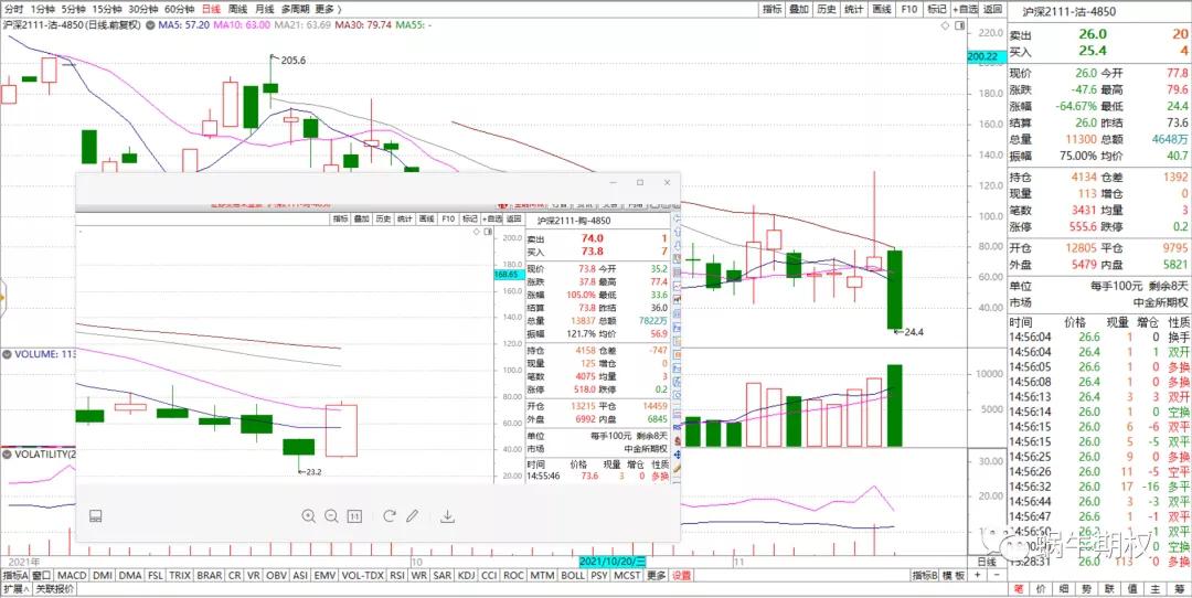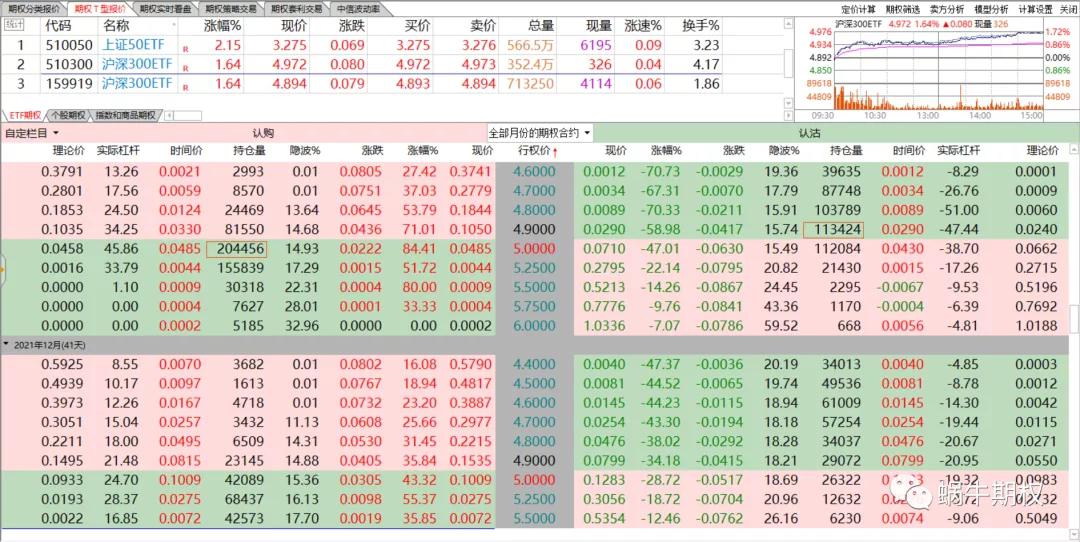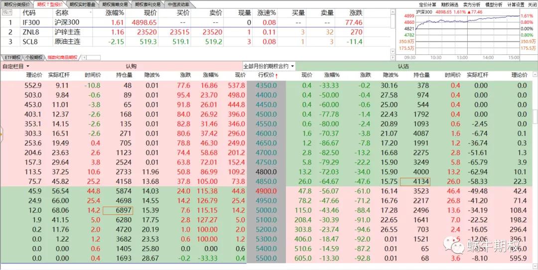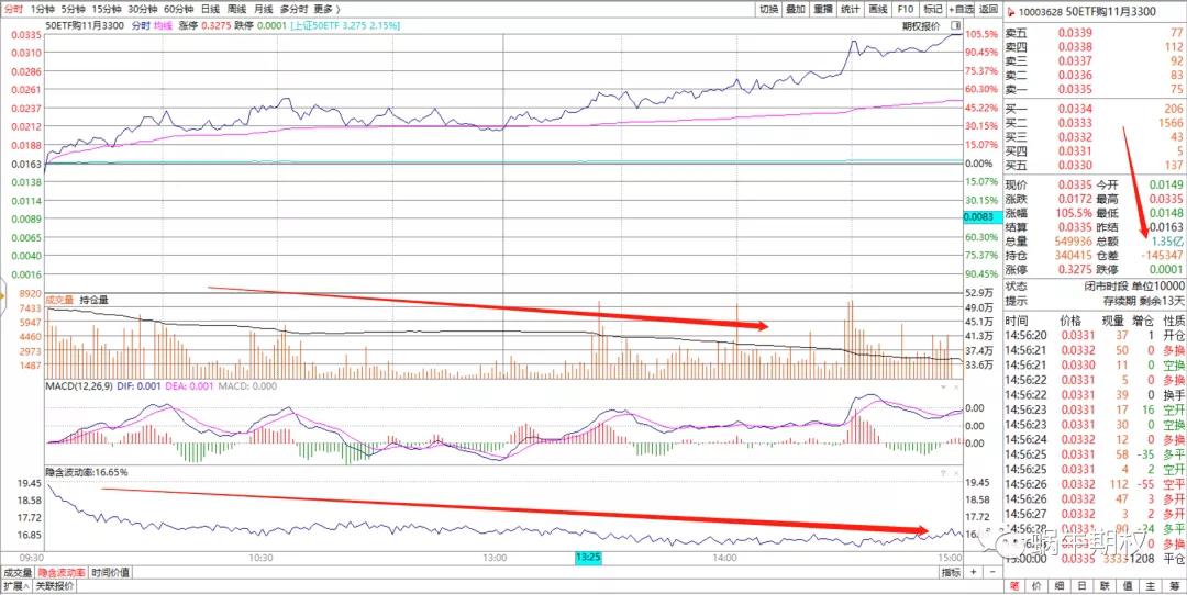这是为什么呢? 看看平值附近的合约,认购前几天天天跌,今天终于上涨,可能上车的人不多。 而认沽昨天冲高大幅回落,今天暴捶,没来得及跑的人也不舒服把。