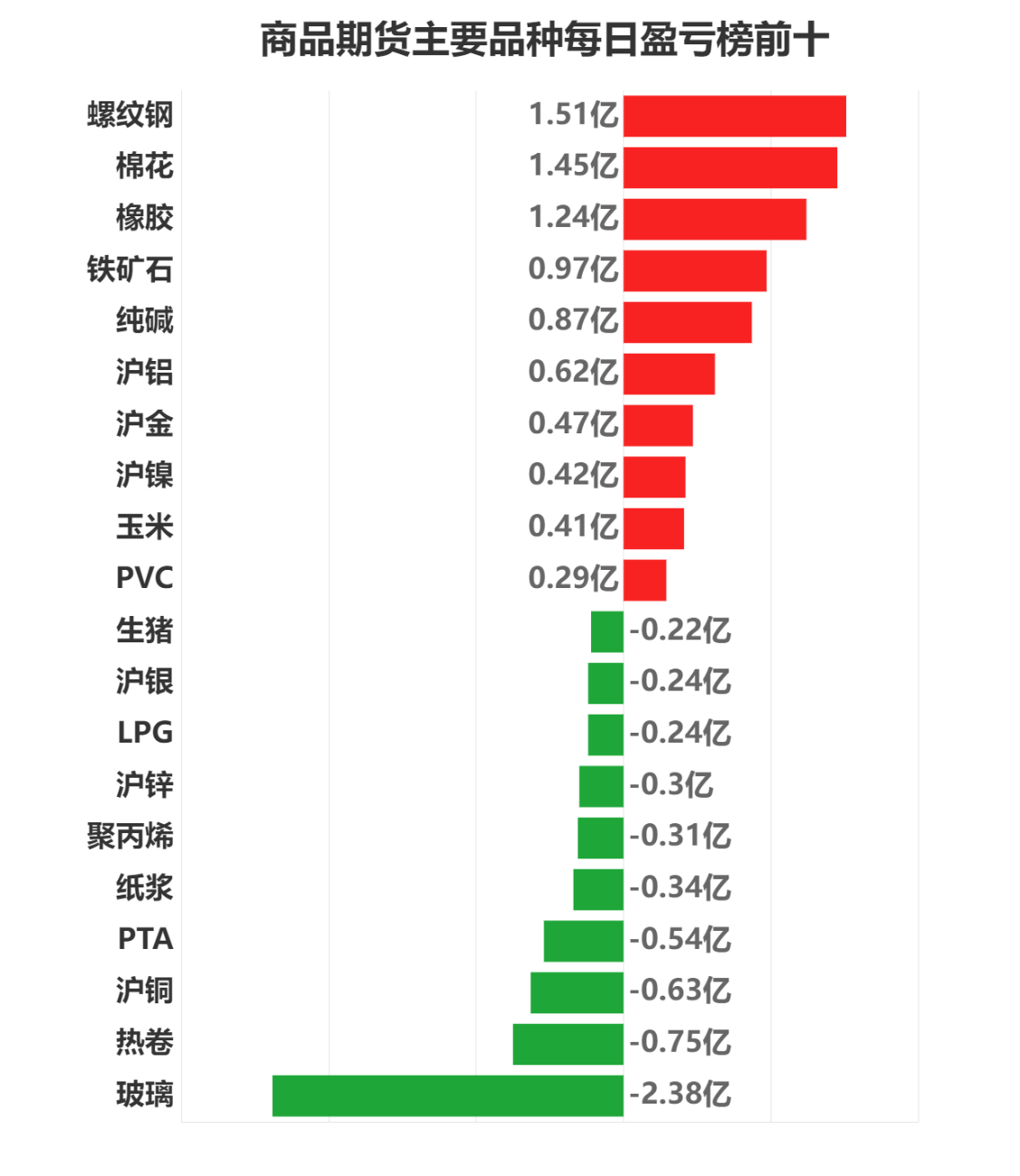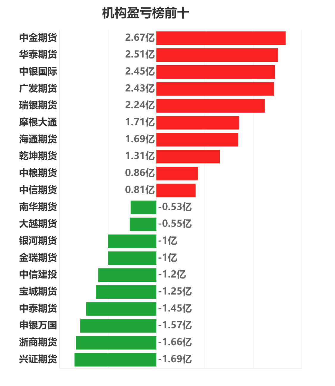 每日市场龙虎榜,带你深度了解市场。 市场一览:周三商品期货综合指数下跌0.97%,日内资金净流入0.35亿元。 市场成交量为3575.84万手,成交额为1.96万亿元。 持仓量为4105.06万手,较前一交易日增加40.18万手。 市场成交量前十和持仓量前十如下图所示: ![]() ![]() ![]() 品种盈亏榜:今日商品期货中螺纹钢盈利第一,为1.51亿元。 玻璃亏损第一,为2.38亿元。 ![]() 就螺纹钢而言,今日席位盈利前三为格林期货、申银万国、永安期货,分别盈利4547.78万元、3975.42万元、3800.71万元。 今日席位亏损前三为山金期货、浙商期货、中泰期货,分别亏损3227.73万元、2907.52万元、2789.82万元。 ![]() 就玻璃而言,今日席位盈利前三为宝城期货、一德期货、美尔雅,分别盈利3994.72万元、985.27万元、820.07万元。 今日席位亏损前三为中泰期货、浙商期货、方正中期,分别亏损8646.77万元、5641.14万元、3097.23万元。 ![]() 席位盈亏榜:今日机构席位中中金期货盈利第一,为2.67亿元。 兴证期货亏损第一,为1.69亿元。 ![]() 就中金期货而言,今日品种盈利前三为沪深、中证500股指、上证,分别盈利10071.34万元、7615.48万元、4558.13万元。 今日品种亏损前三为棉花、白糖、纸浆,分别亏损802.24万元、464.04万元、308.88万元。 ![]() 就兴证期货而言,今日品种盈利前三为沪银、豆粕、纯碱,分别盈利406.60万元、372.16万元、206.60万元。 今日品种亏损前三为中证500股指、铁矿石、豆油,分别亏损8503.13万元、2046.97万元、1605.54万元。 ![]() (文章来源:东方财富研究中心) (责任编辑:admin) |